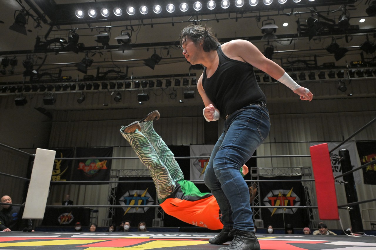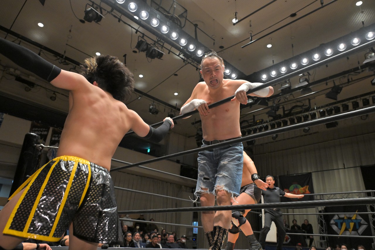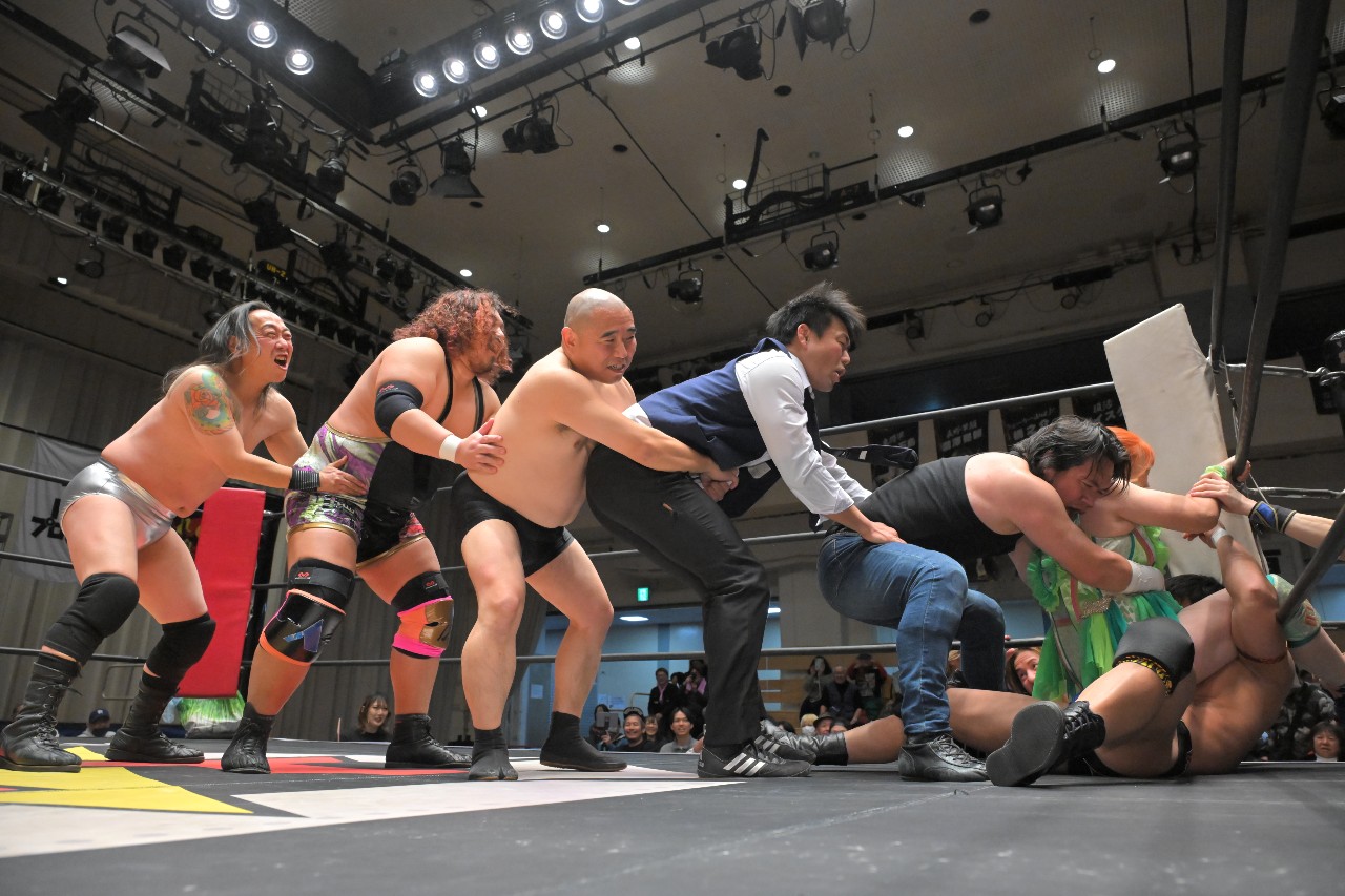 残るは、秀旺&瀧澤vs磐城という構図。秀旺と瀧澤がそれぞれビッグブーツを見舞い、秀旺がチャンス of LOVE(※ニールキック)。2人でOTRさせようとするが、磐城が秀旺のタックルを瀧澤に誤爆させ、瀧澤がOTRで失格に。