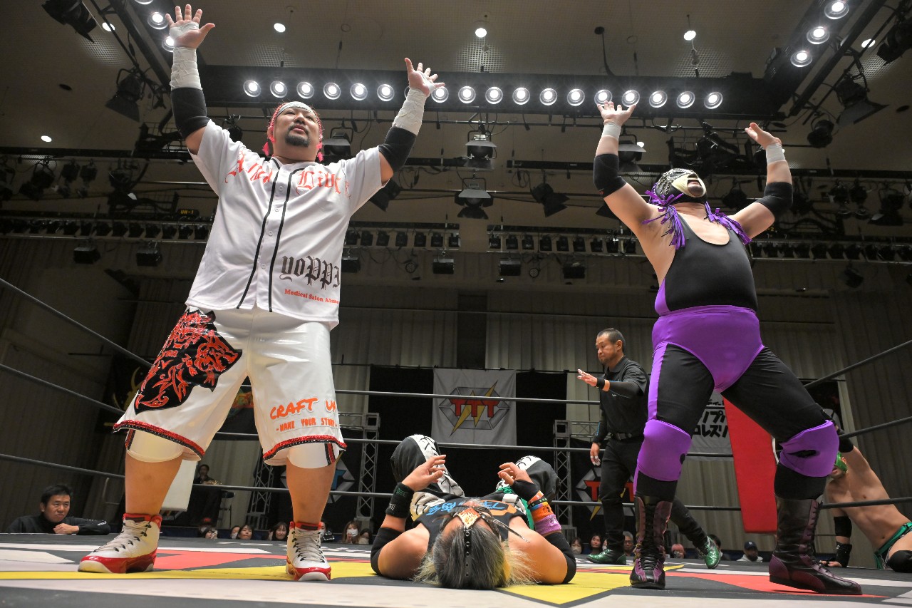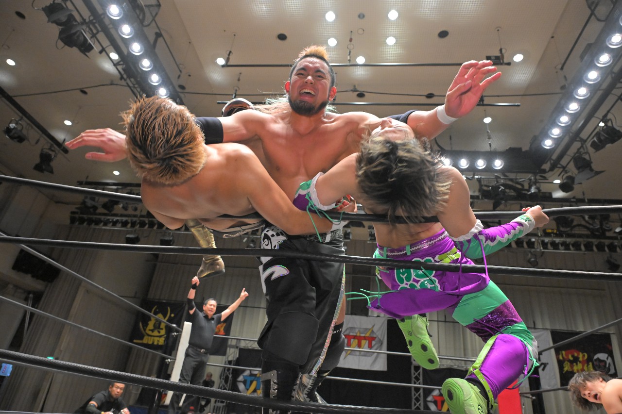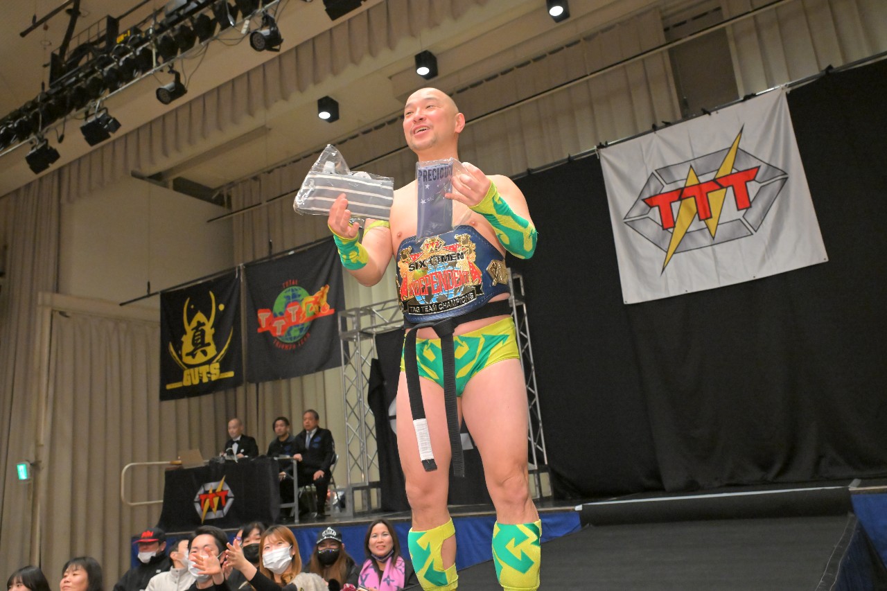 ガッツ「また正月明けで皆さんお金なくて迷惑だと思いますが、またTTTに付き合って後楽園ホールに来ていただけたらなと思いますので、皆さん応援よろしくお願いします!いつもの締めやろ?いつもの締め!TTTにはアントニオ猪木さんの『1!2!3!ダーッ!』みたいのがあるんですよ。みなさんと一緒にやりたいので、是非ご起立お願いします。俺が『シングル!ダブル!』って言ったら『トリプルT!』で締めますんで。皆さんお付き合いお願いします。行くぞーッ!シングル!ダブル!トリプルT!ありがとうございましたッ!」