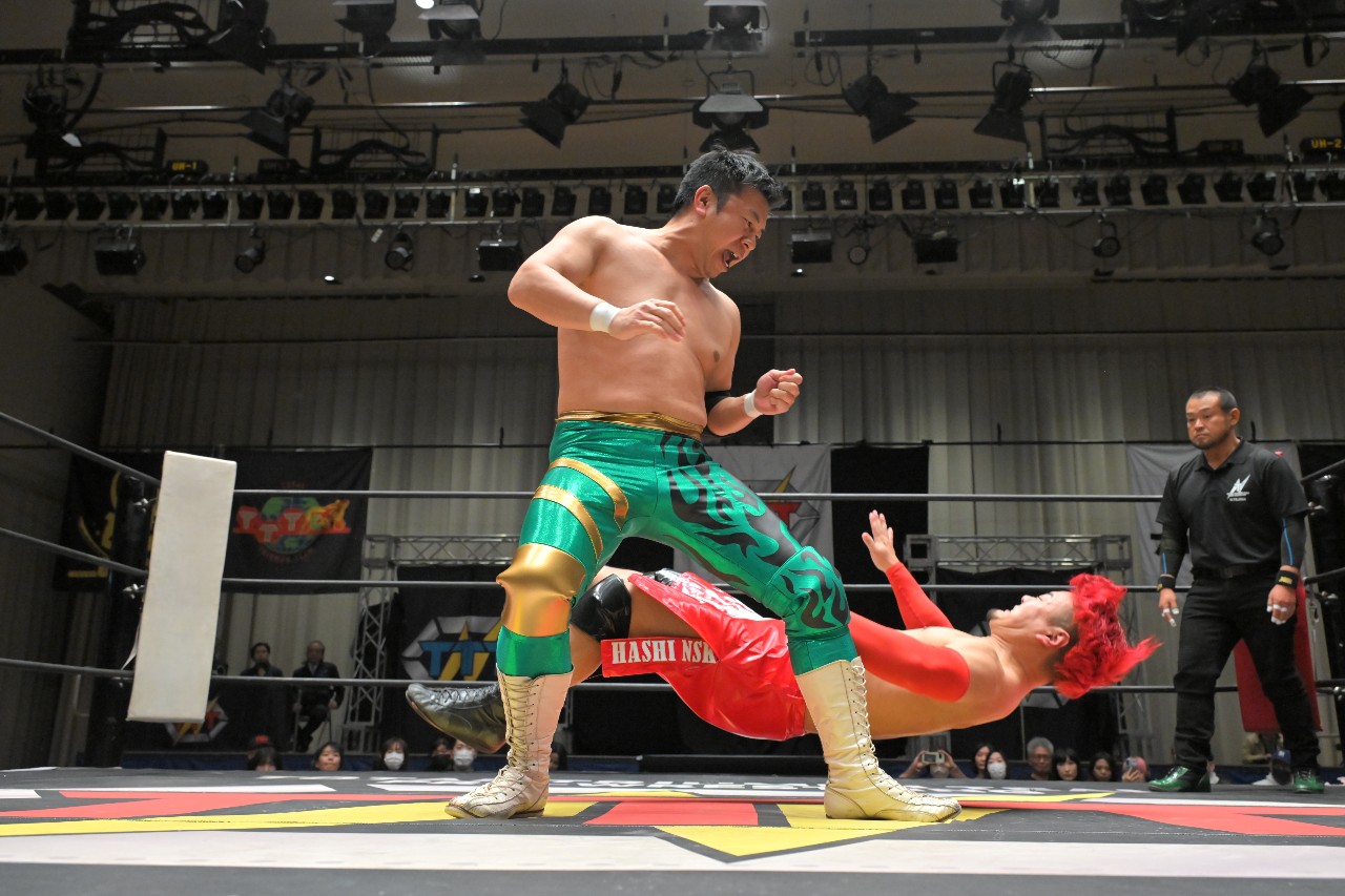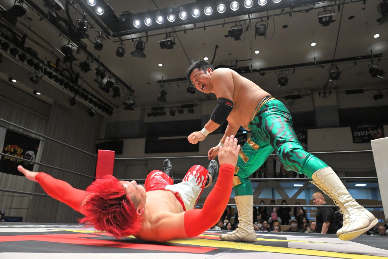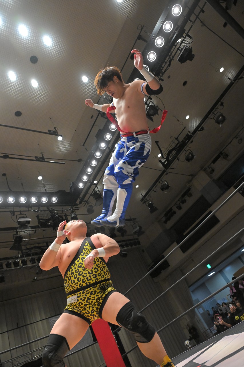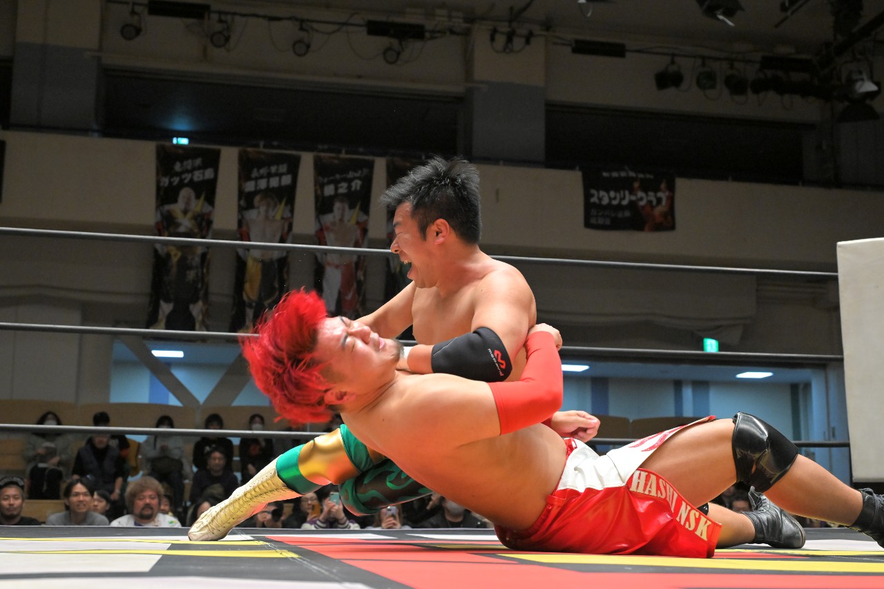 橋之介もエルボー連打で突っ張っていくが、ダイスケは逆水平チョップに切り替えて打ち返してロープに振るが、橋之介がハンドスプリングエルボーで反撃。さらに串刺しジャンピングニーからロープに飛ぶが、ダイスケがカウンターのドロップキックで反撃を断ち切る。