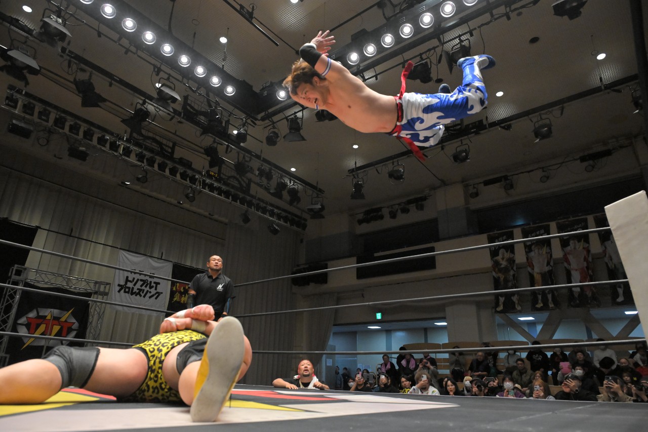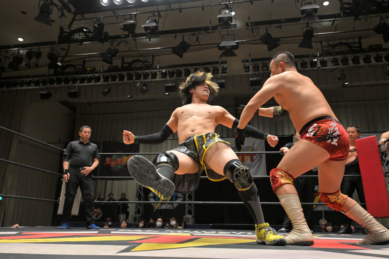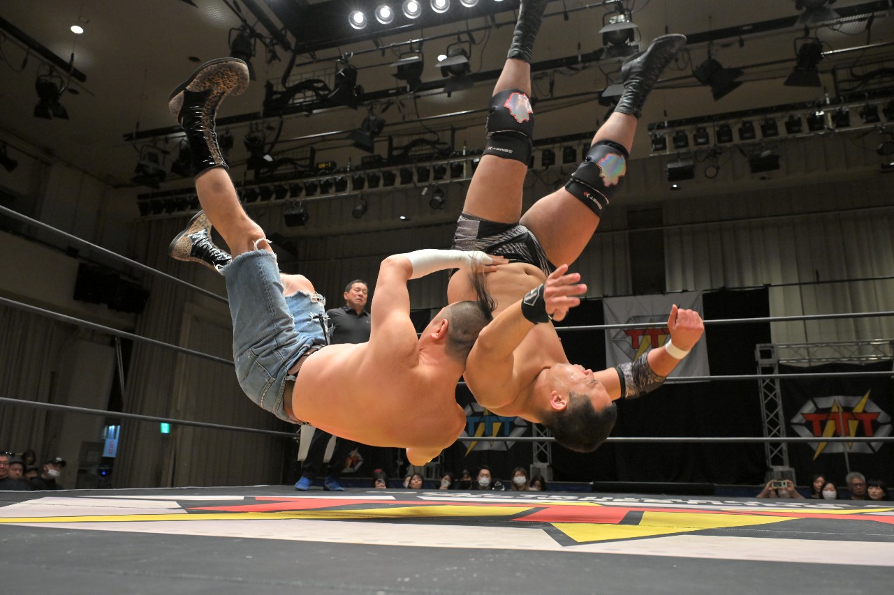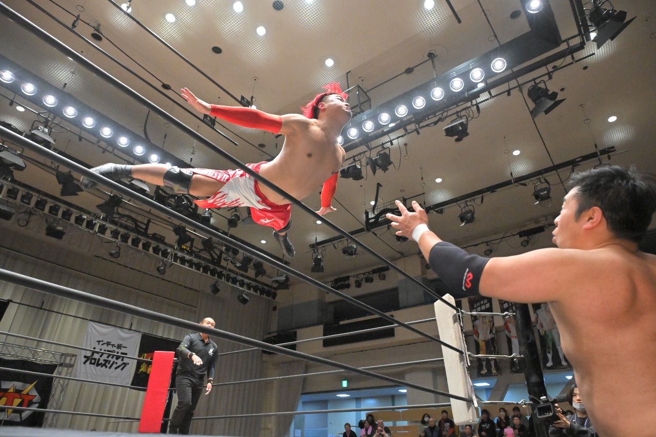 橋之介もエルボー連打で突っ張っていくが、ダイスケは逆水平チョップに切り替えて打ち返してロープに振るが、橋之介がハンドスプリングエルボーで反撃。さらに串刺しジャンピングニーからロープに飛ぶが、ダイスケがカウンターのドロップキックで反撃を断ち切る。