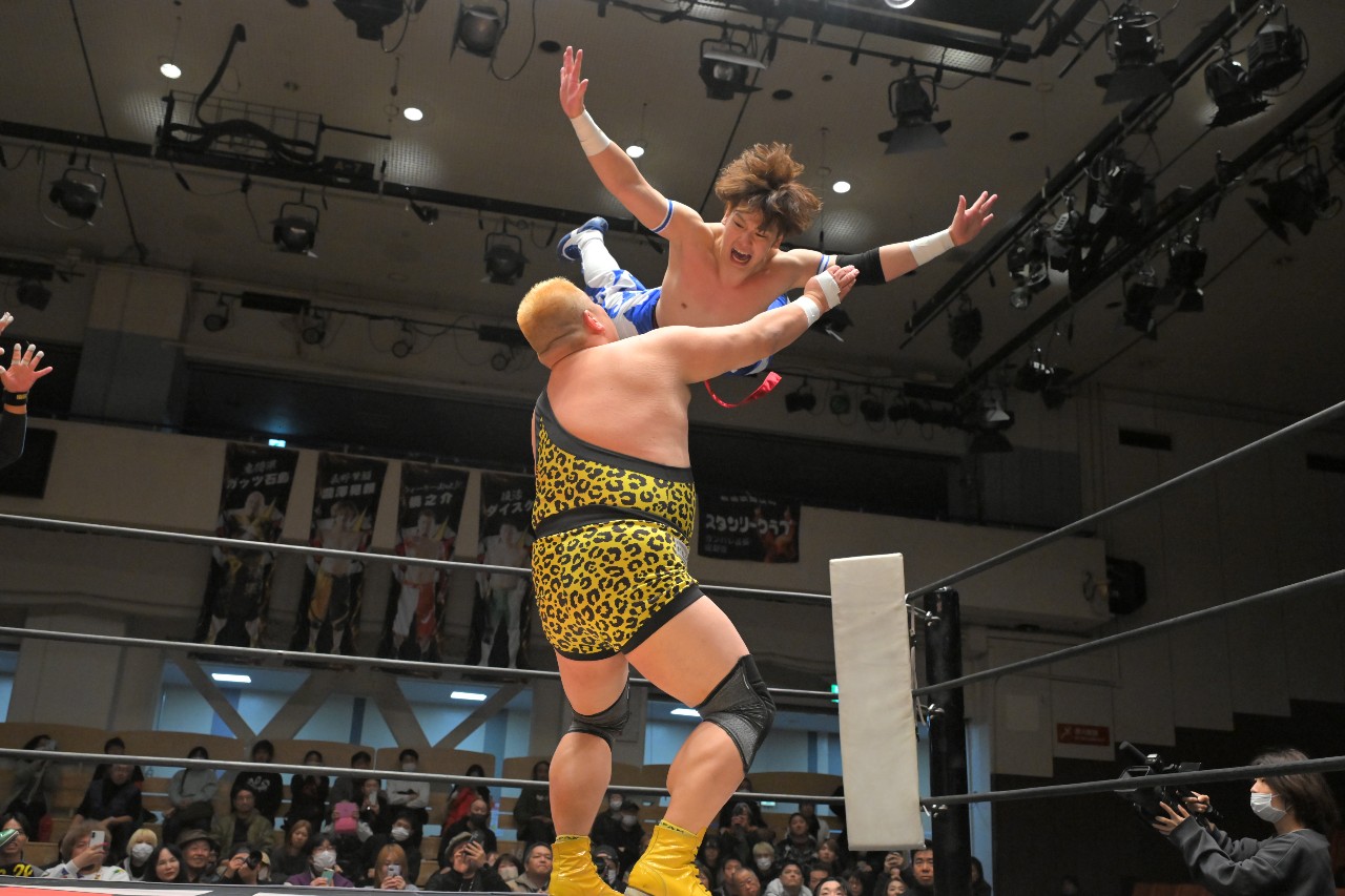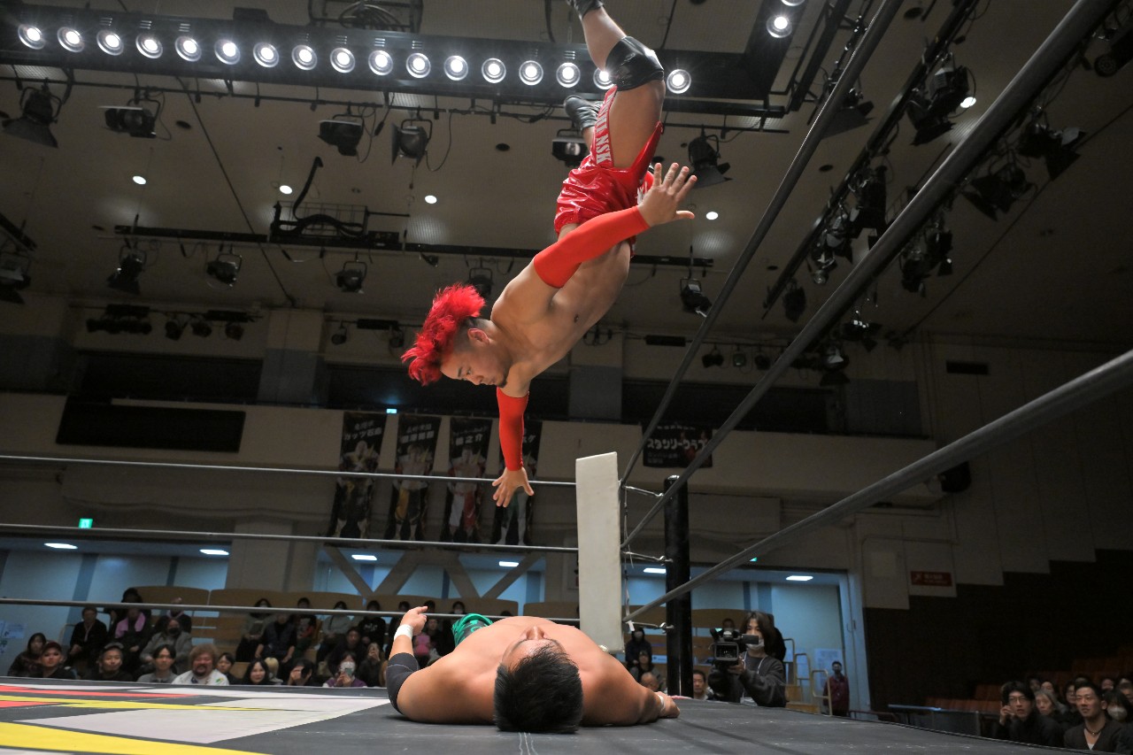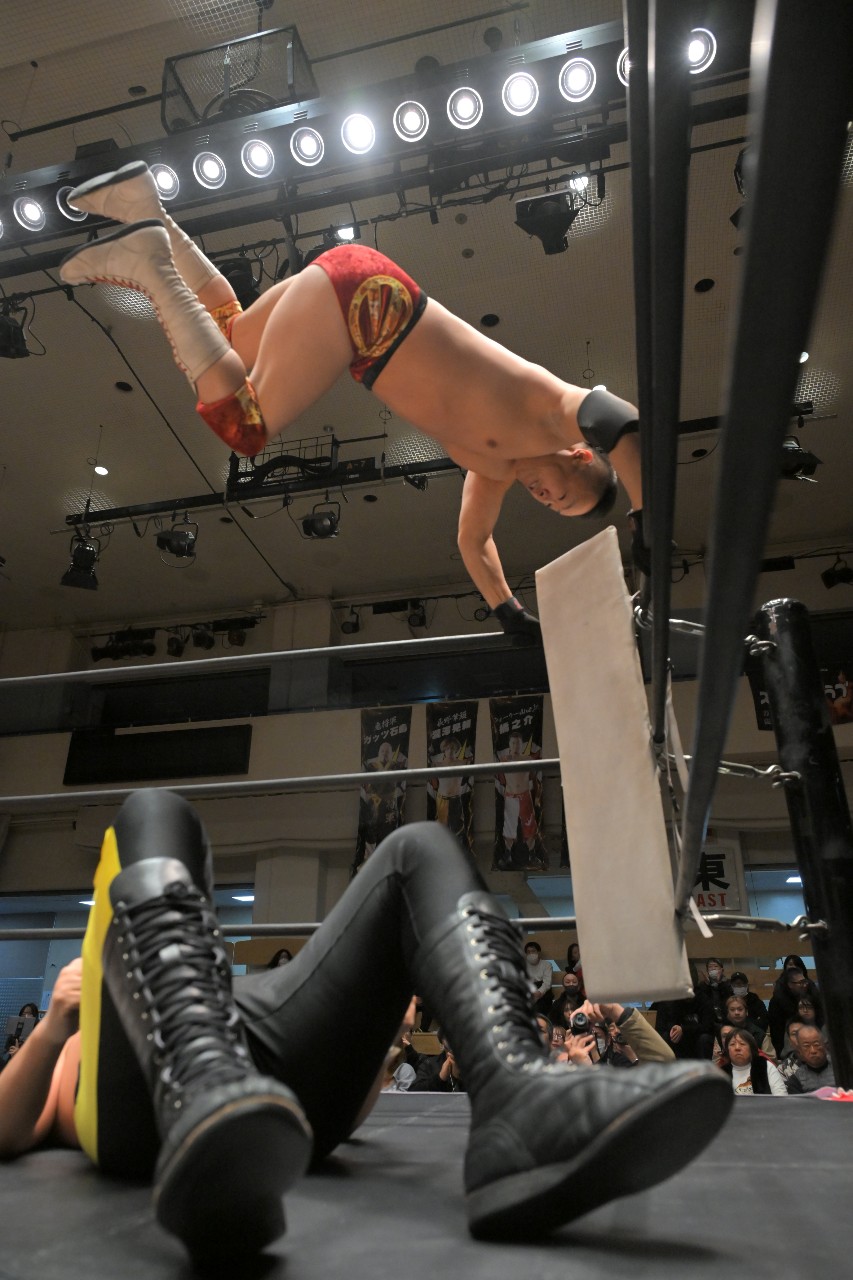 セカンドコンタクトは再びロックアップ。ダイスケがヘッドロックからショルダータックルで倒していくが、橋之介は追撃をかわしてヒップトスからの側転低空ドロップキックで反撃。場外に逃れたダイスケへノータッチ・トペ・コンヒーロを見舞って一気に流れを掴む。