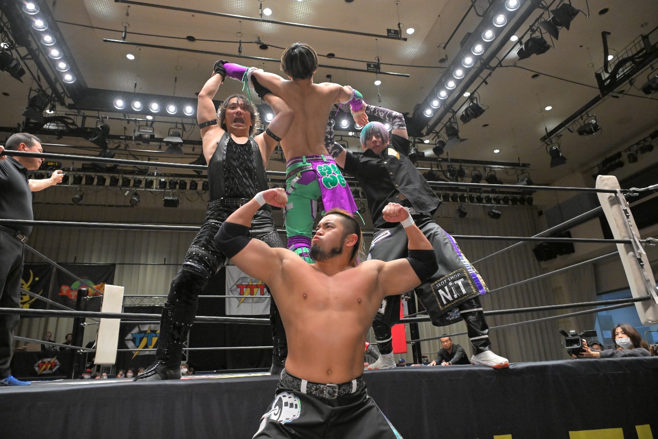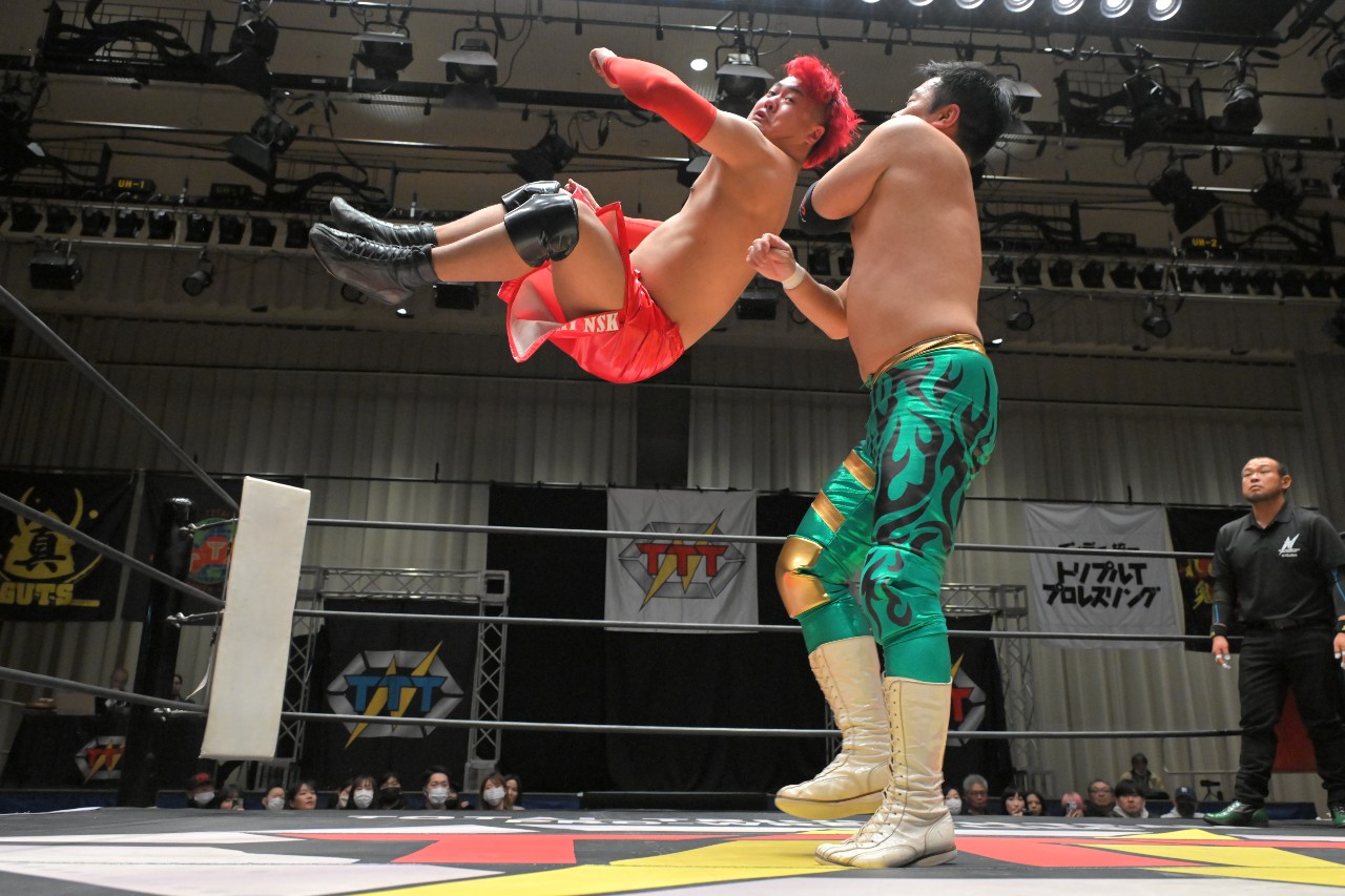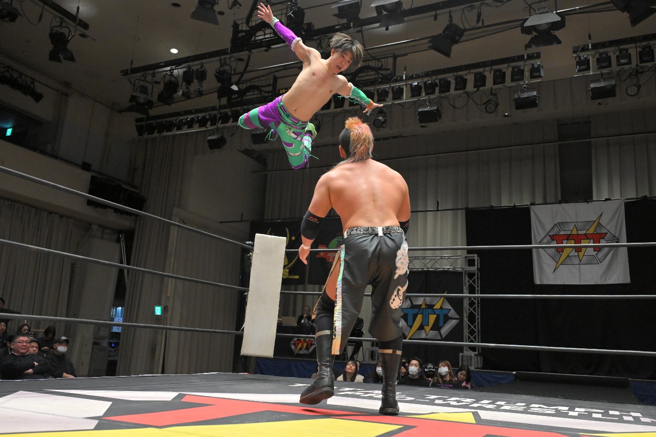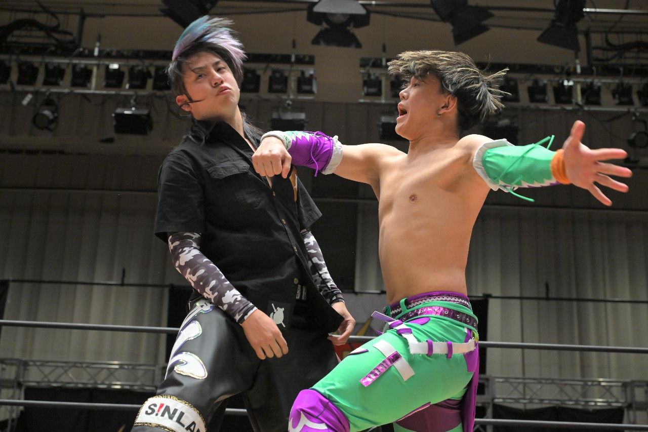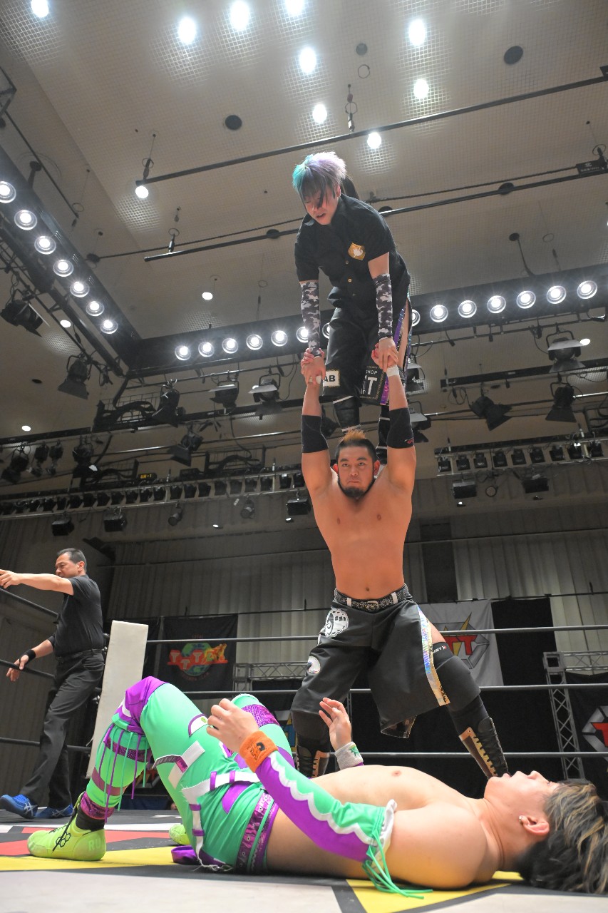 定は藤田をフロント・スープレックスで投げ捨て、綾斗にはトラースキックからスロイダー。綾斗&藤田が2人でロープに振るが、定がショットガン・ドロップキックで2人まとめて吹っ飛ばす。定が綾斗にMADE IN NERIMAを狙うが、綾斗がコブラツイストで切り返す。定が腰投げで叩きつけてコーナーへの串刺し攻撃を狙うが、綾斗が綾斗ニーからランニング・ネックブリーカー・ドロップ。綾斗が藤田にタッチ。