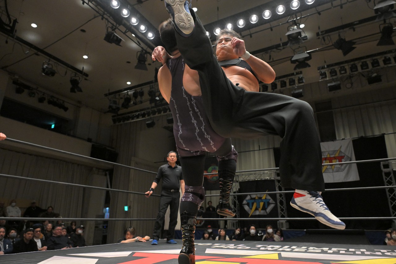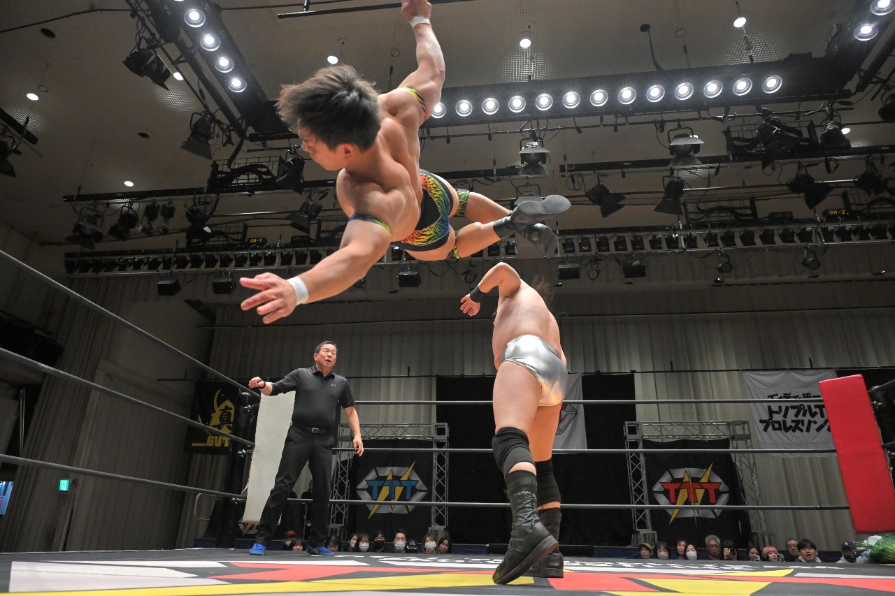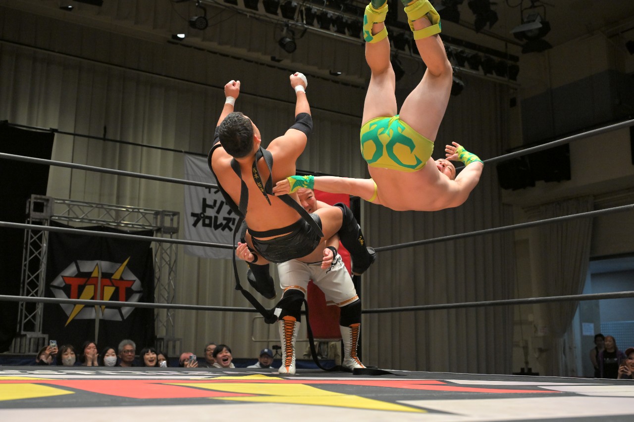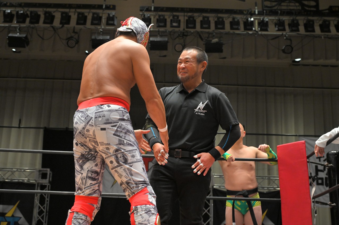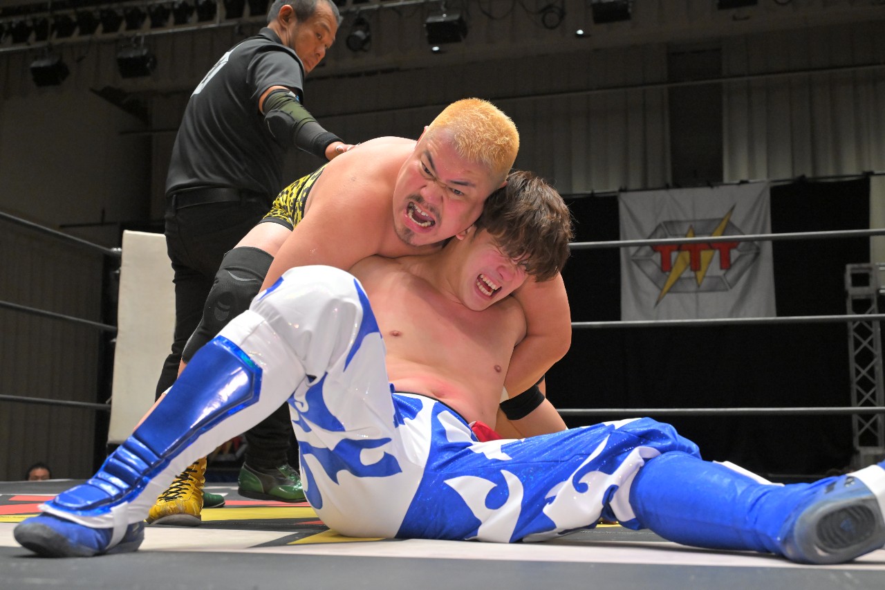 定は藤田をフロント・スープレックスで投げ捨て、綾斗にはトラースキックからスロイダー。綾斗&藤田が2人でロープに振るが、定がショットガン・ドロップキックで2人まとめて吹っ飛ばす。定が綾斗にMADE IN NERIMAを狙うが、綾斗がコブラツイストで切り返す。定が腰投げで叩きつけてコーナーへの串刺し攻撃を狙うが、綾斗が綾斗ニーからランニング・ネックブリーカー・ドロップ。綾斗が藤田にタッチ。