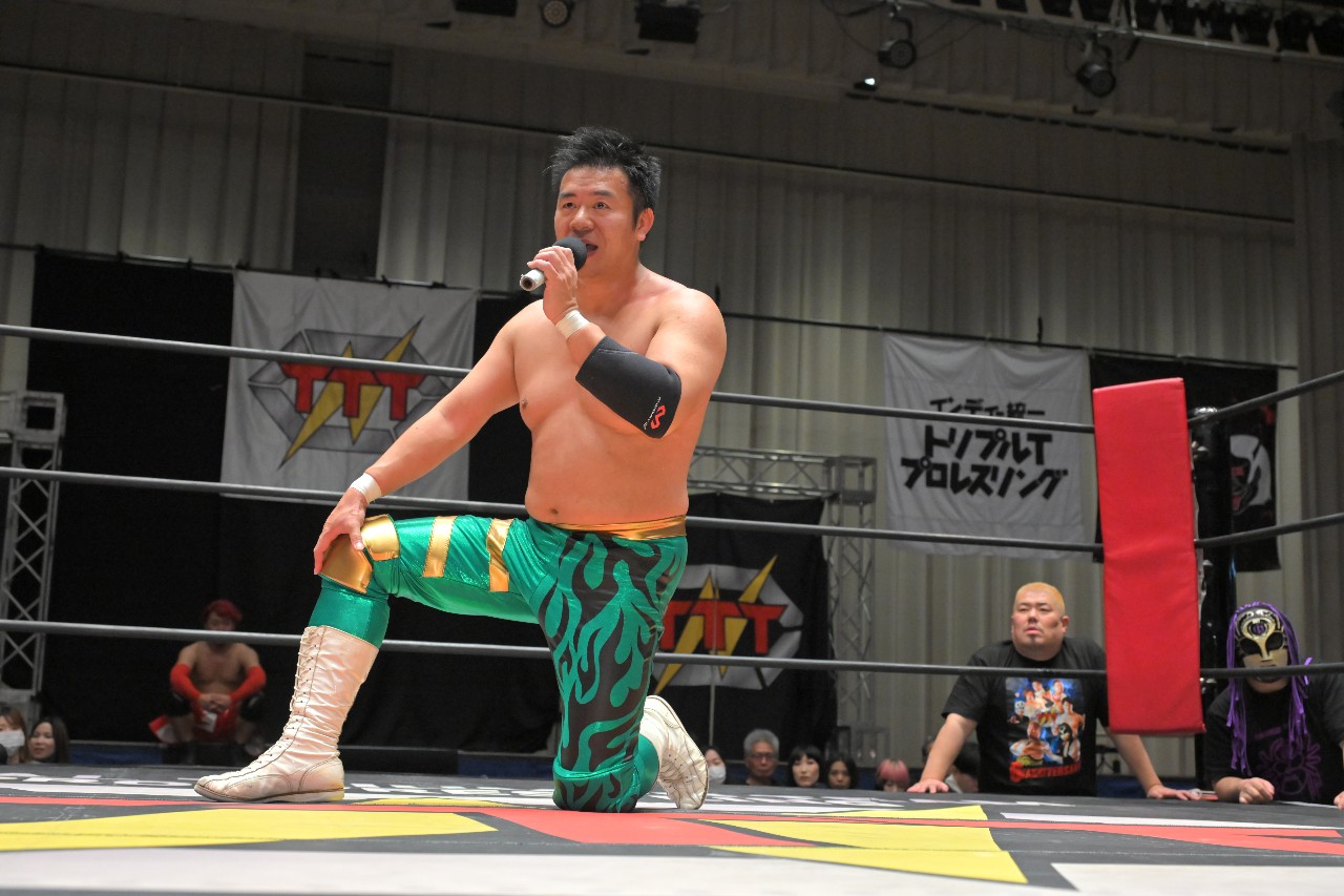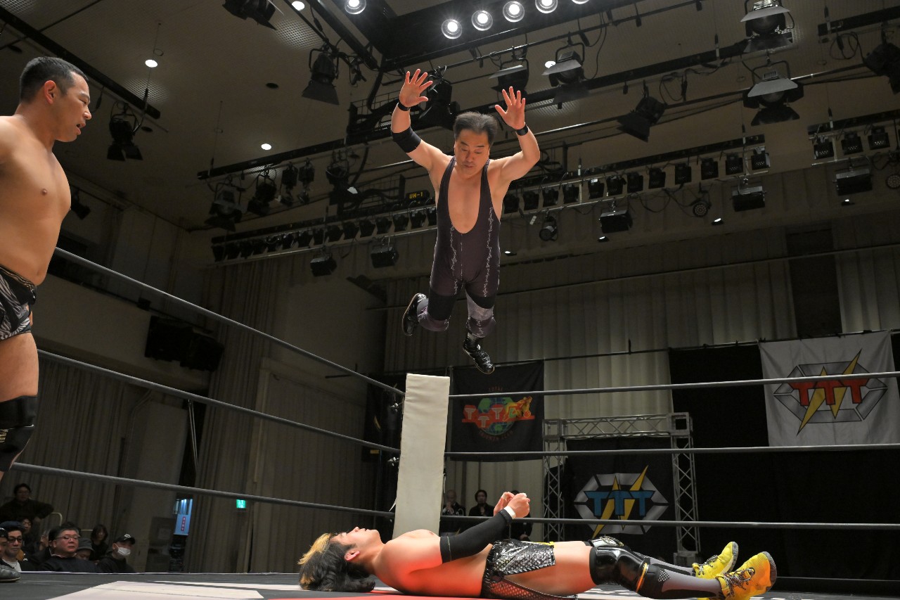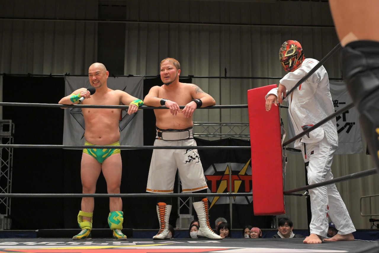 ダイスケ「後楽園にお集まりの皆さん、こんばんは!8年前に引退して、本日限定復帰3回目のダイスケです!引退してからシングルは初だったんで、やっぱり橋之介は強くて負けちゃいましたけど、まだ……まだまだ、動けるかな?2026年1発目ということで、今年の抱負!ダイスケ、本格的に!……限定復帰します!TTTのためだけに仕事とスケジュールが許す限り、2026年は年に1回と言わず、もうちょっと団体のために働いて参ろうと思っております。なので、本格的な限定復帰です!年に何回出れるかわからないですけど、とりあえず次回は2月14日、新木場大会!皆さん、新木場でお会いしましょう!」