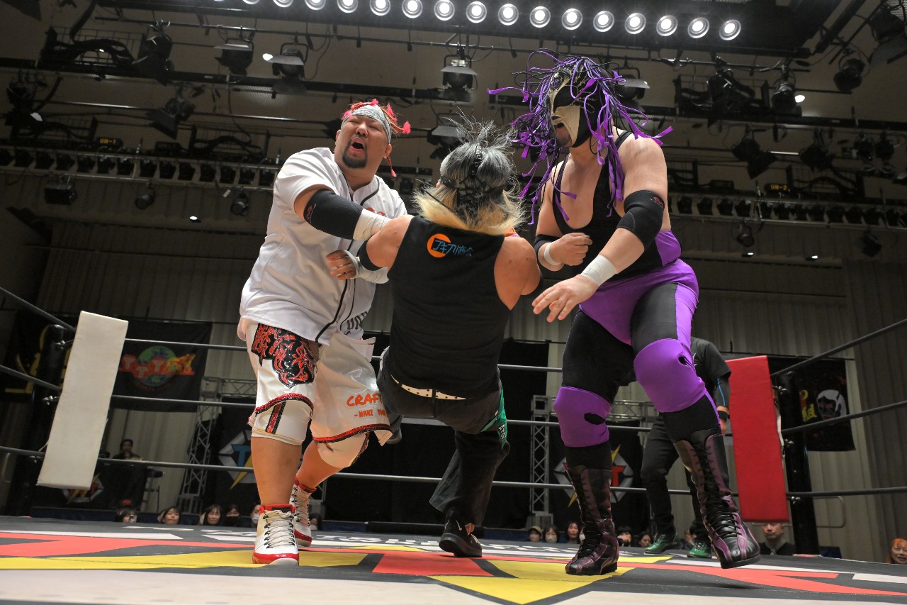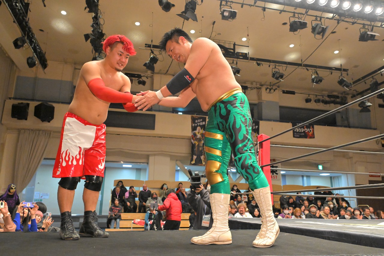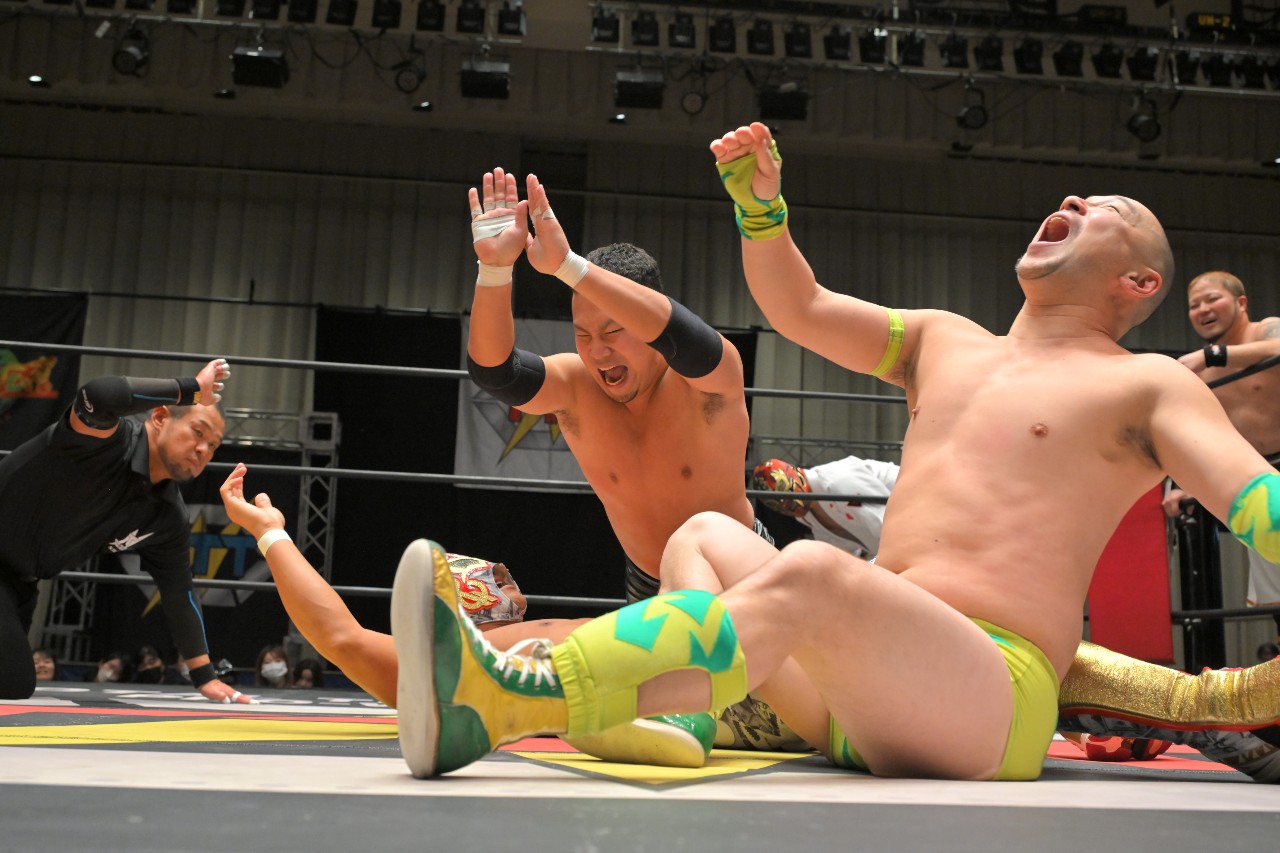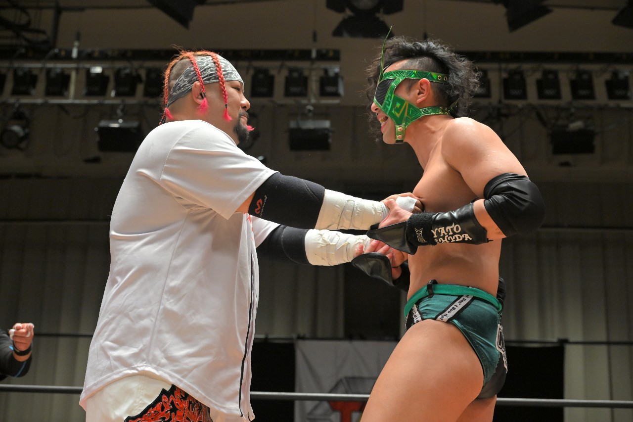 勝負を託されたミステリーが藤田にチョークスラムを狙うが、藤田がアームドラッグで切り返し、ロープに足をかけながらのスクールボーイで3カウント。混戦を制した綾斗&藤田が2度目の防衛に成功した。