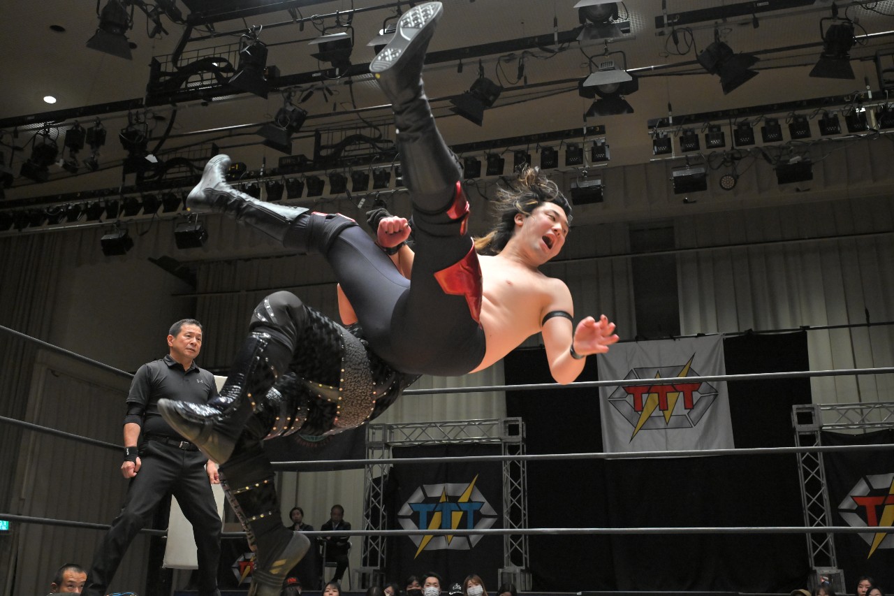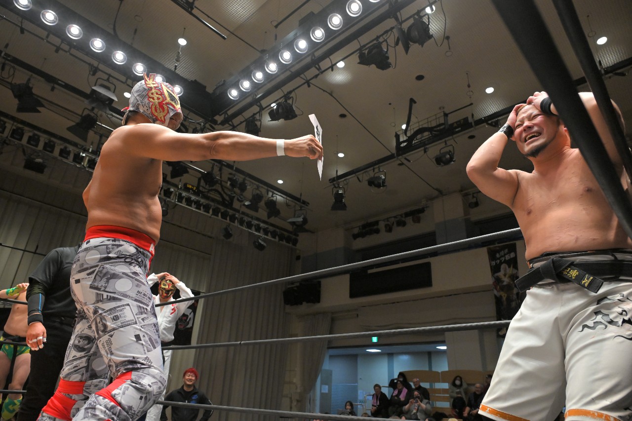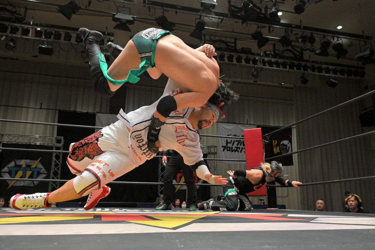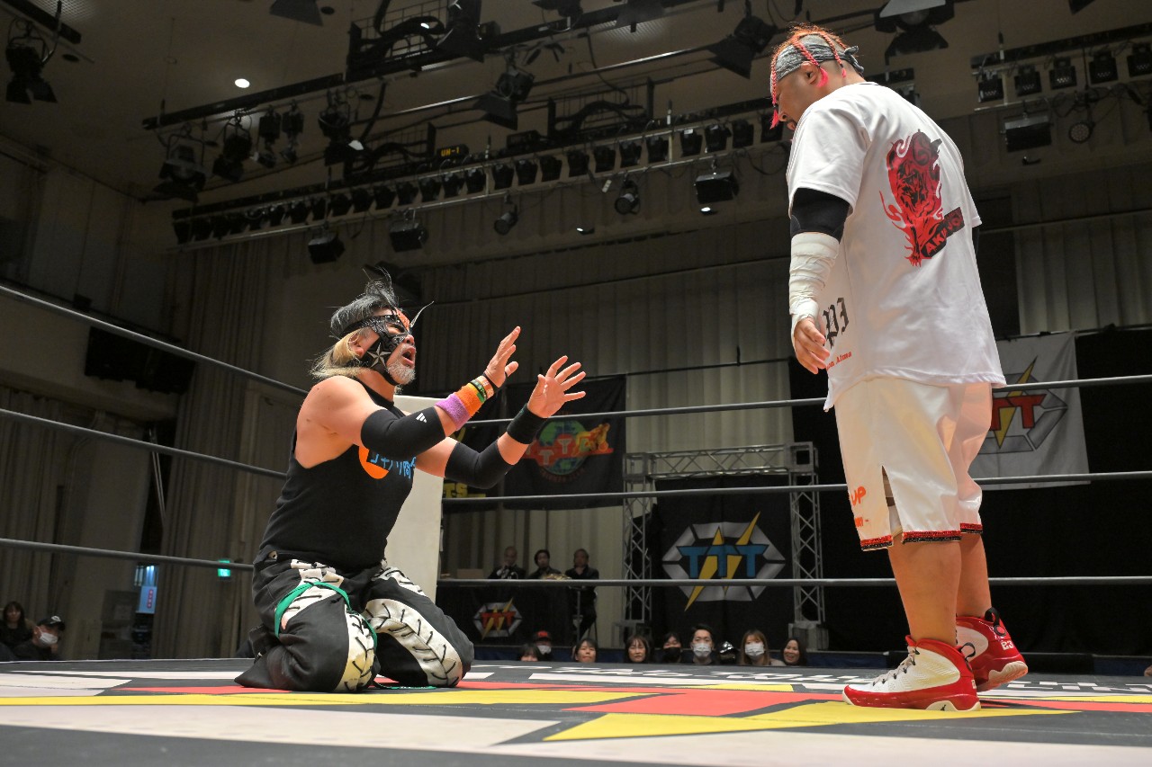 勝負を託されたミステリーが藤田にチョークスラムを狙うが、藤田がアームドラッグで切り返し、ロープに足をかけながらのスクールボーイで3カウント。混戦を制した綾斗&藤田が2度目の防衛に成功した。