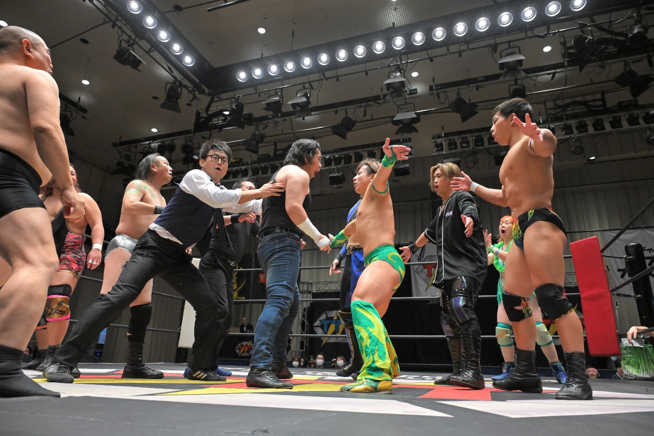 川上が長い足を活かしてビッグブーツ連打からジャンピング・バックエルボー、レッグラリアートと連撃。川上がバックドロップを狙うが、進が振り払ってキチンシンクからストマック・ブロック。さらにクロスフェイスで捕らえるが、宗達が慌ててカット。渡瀬&宗達が2人がかりで中野を場外に放り出そうとするが、中野が619で2人の意表を突いた攻撃を見舞い、神野がダブルラリアットで場外に叩き出す。そして神野が中野をショルダースルーでホイップする形で中野がプランチャを見舞う。