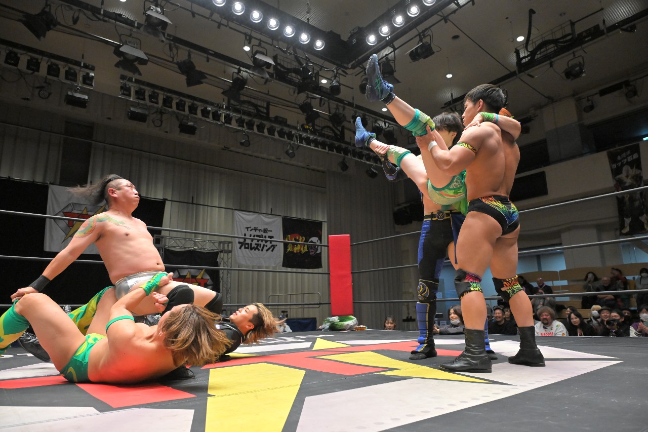 リング上に秀旺&瀧澤が上がってくると、瀧澤のバイシクル・キックから秀旺のバックドロップ。さらに藤田がダイビング・ボディプレスを見舞うもカウント2。ならばと藤田が「サヨナラーッ!」と叫びながらSAYONARAを決めるもカウント2。藤田がロープに飛ぶと、定が飛び込んできて必殺のスパインバスター。エプロンに立つ秀旺&瀧澤もショットガン・ドロップキックで場外へとふっ飛ばし、綾斗も場外へ排除。