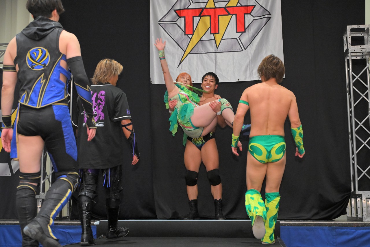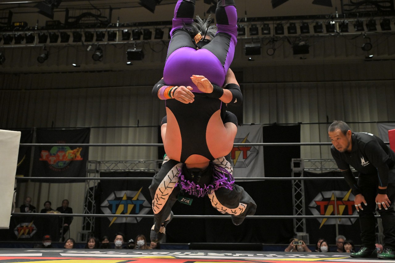 松澤さんは「アレ行くぞ~!」と口にネギを咥え、世界一おぞましい禰豆子に変身。光珠&刃が松澤さんを抱え上げて大開脚。オースギ&政岡がモンキーフリップでビッグベアーを頭から松澤さんの秘所へと投げ込み、松澤さんが顔面騎乗式三角絞めで失神KO勝利。この合体攻撃の名はラフレシア。名前から威力が想像できる恐ろしい新技での決着となった。