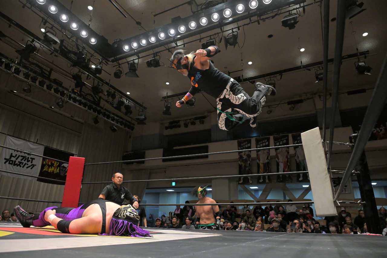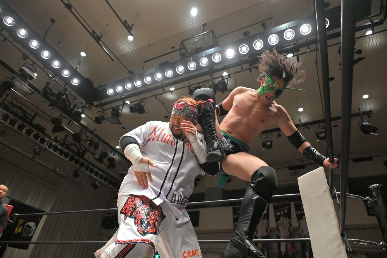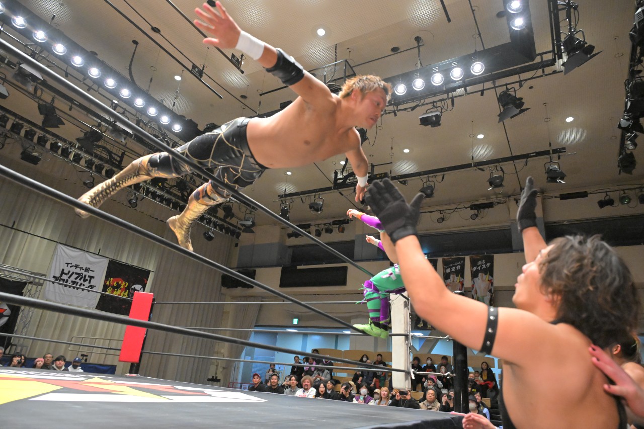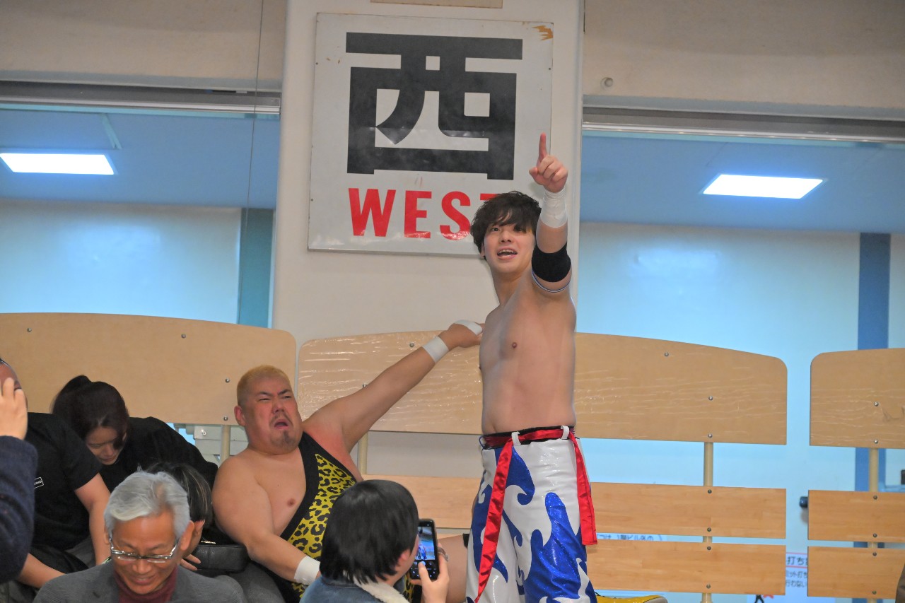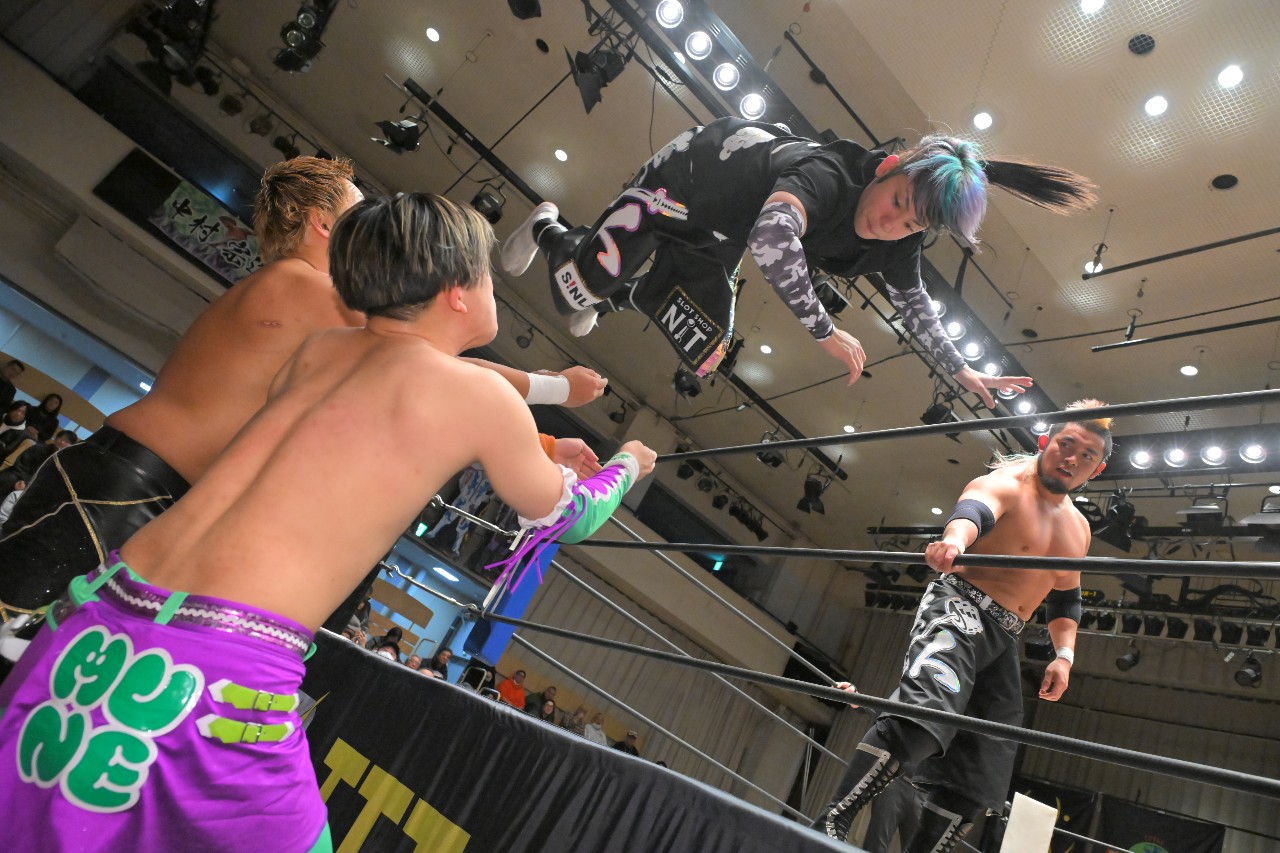 代わる神野がパンプハンドル式のアバランシュ・ホールドから串刺しラリアットを狙うが、宗達がエプロンに逃れてかわし、ダイビング・クロスボディ。渡瀬にタッチ。