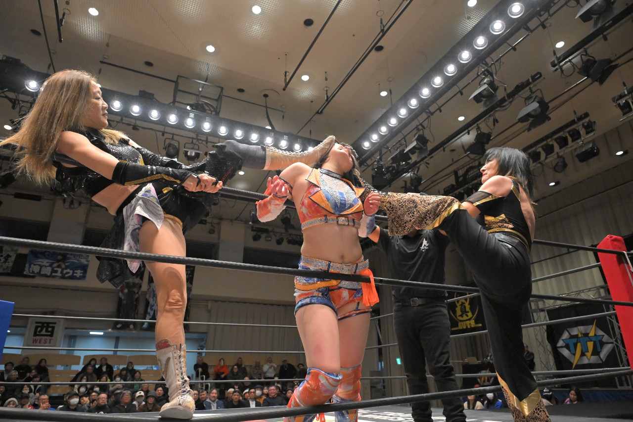 薮下は黒帯でナナミを殴打していくが、ナナミは串刺しボディスプラッシュからショルダータックル。薮下は髪を掴んで引き倒してからロープに飛ぶが、ナナミがカウンターのデスバレー・ドライバーを決めて生還。香藤にタッチ。