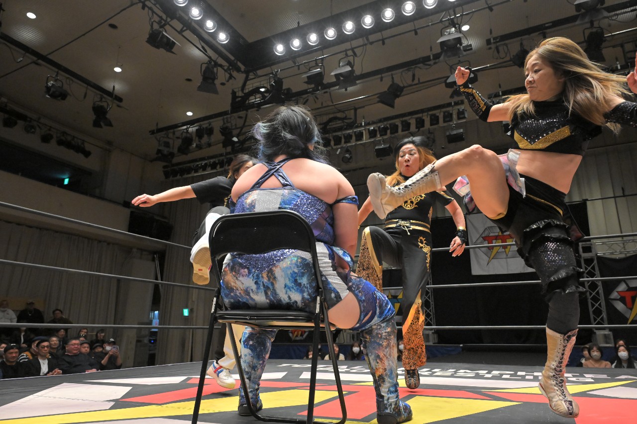 ジャガーはローリング・かかと落としを見舞ってロープに振るが、香藤がクロスボディからドロップキック、ヒップドロップと体格を活かした連撃。さらにボディスラムで叩きつけてセカンドからのダイビング・ボディプレスを発射も、ジャガーが回避。香藤が自爆したところに薮下が黒帯攻撃を見舞い、ジャガーがイスを持ち込んでリング中央にセット。香藤を座らせた上でジャガー&薮下&綾子のトリプルビッグブーツ。さらに薮下&綾子が同じコーナーから同時に飛ぶミサイルキック。最後はジャガーがセカンドからのダイビング・ローリング・かかと落としで3カウントを奪った。