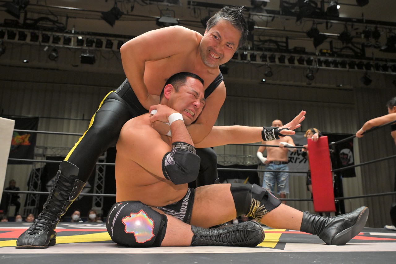 最後は秀旺と磐城の一騎打ち。互いに強烈なチョップを打ち合う攻防が展開。磐城が打ち勝ってコーナーチョップから串刺しラリアットを連打。さらにファルコンアローで叩きつけるもカウントは2。ならばと磐城はロープに振ってスパインバスターを決めるが、これもカウント2。
