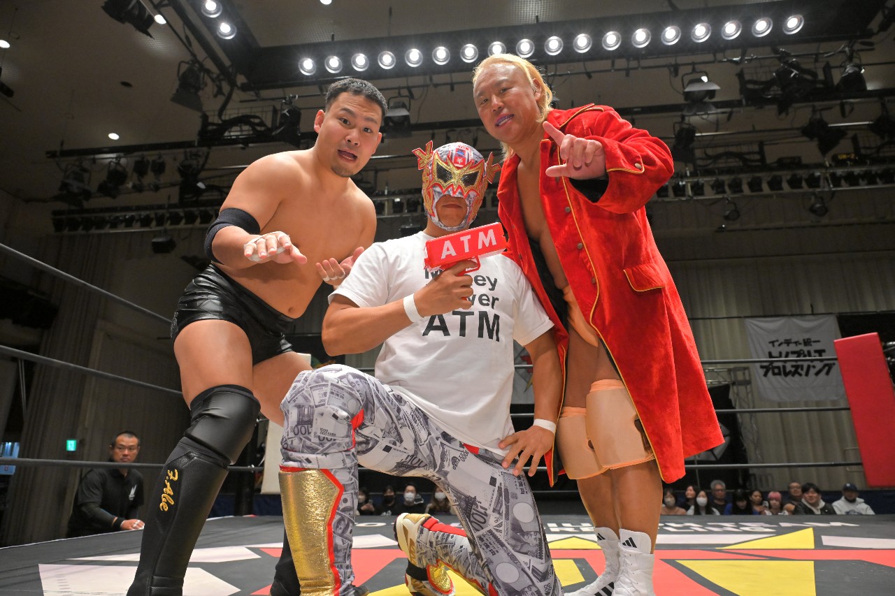 ATMは「効いてるだろ!痩せ我慢してるぞ!」と文句を言いつつ、「おい、チャンピオン。こんなもんか?来い!」と仁王立ち。塚本がエルボー一発で倒してレッグスプレッドで絞り上げると、“お金”と書かれた封筒を差し出して「お金あげるからやめろ!痛いことするな!」と懇願。