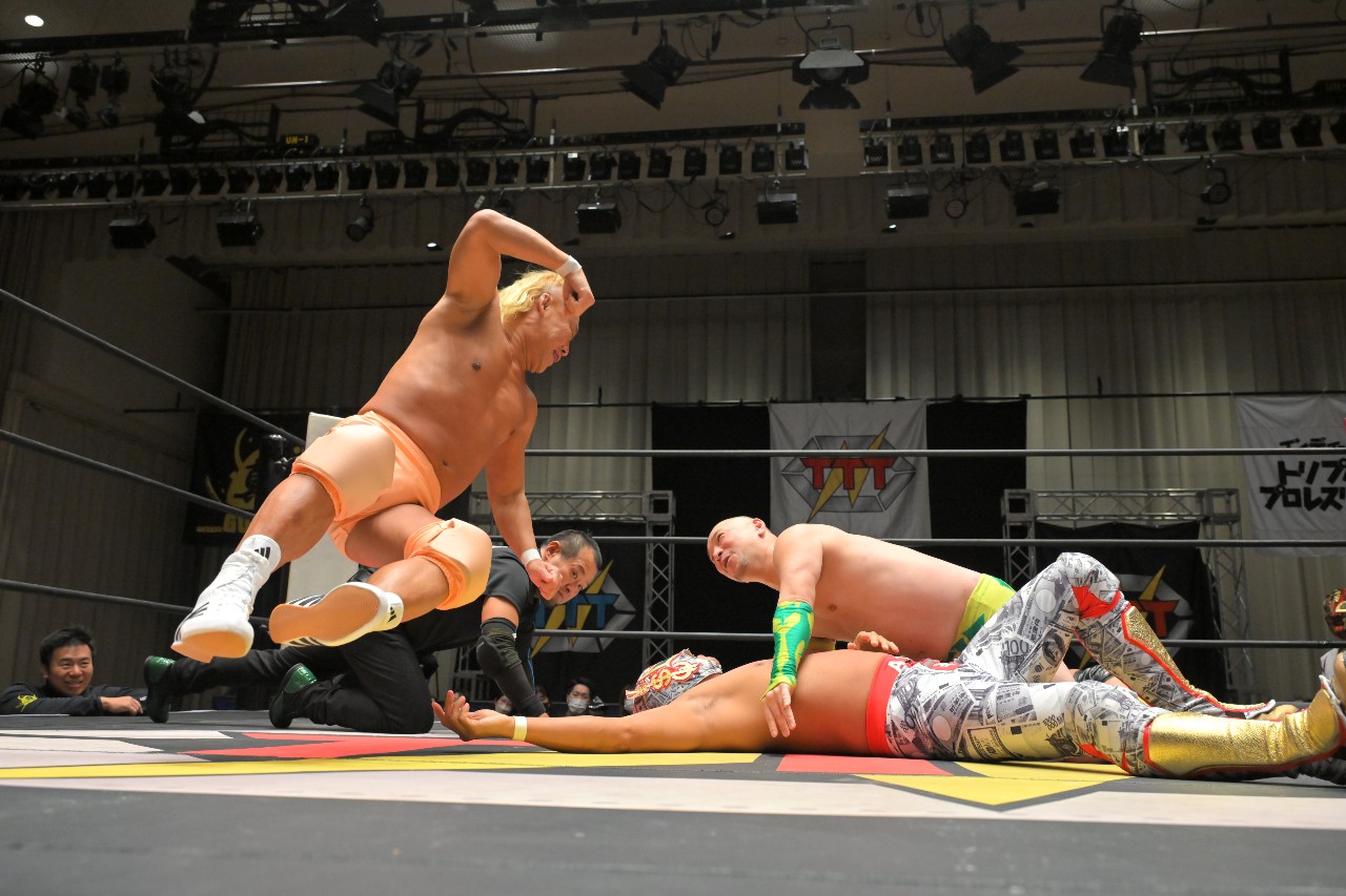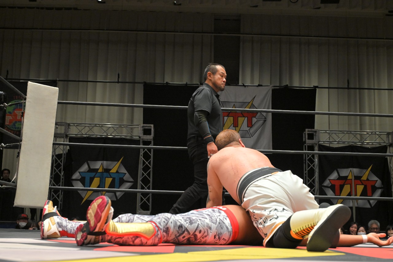 ミステリー&定が2人で連携し、ミステリーのツームストーン・パイルドライバー+定のトラースキックの合体攻撃。完璧に決まるも、瀧澤がレフェリーの足を引いてカウントを妨害。