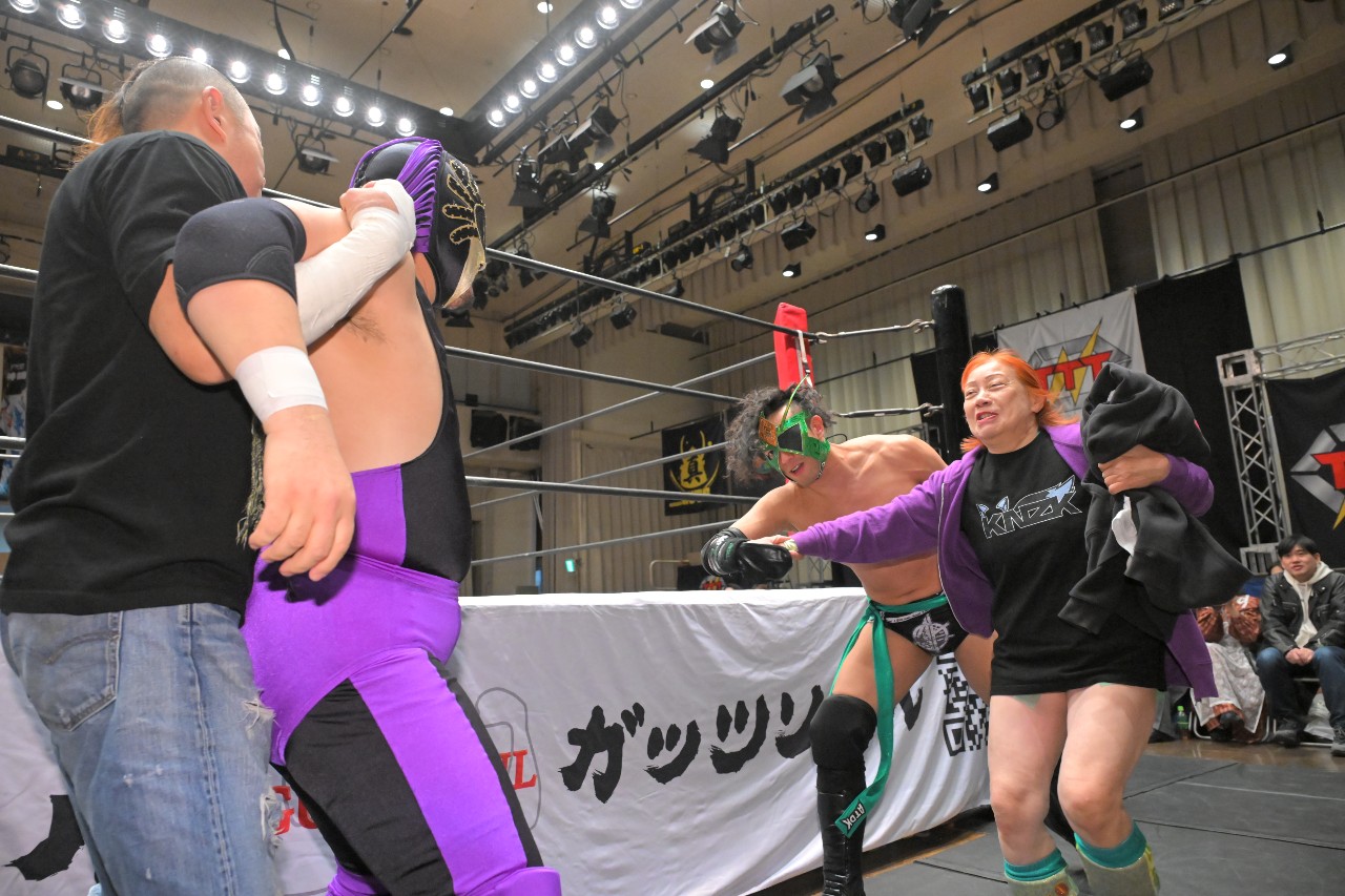 ミステリーが藤田にエルボースタンプを連打してロープに飛ぶが、綾斗がエプロンからビッグブーツ。さらに場外に落とすと、ゴキブリ商会の面々が場外で袋叩きに。そして推し活の一環として綾斗のセコンドに付いていた松澤さんも攻撃に参加させられる。