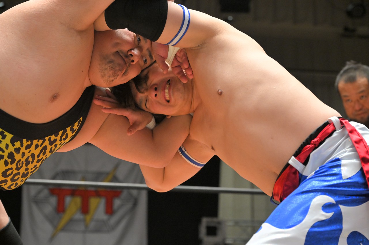 ようやく手4つで組み合うかと想いきや、直前で振り払って「A!T!M!」とポーズを決めてからヒップアタックを連打。しかし、塚本は全くのノーダメージといった様子。