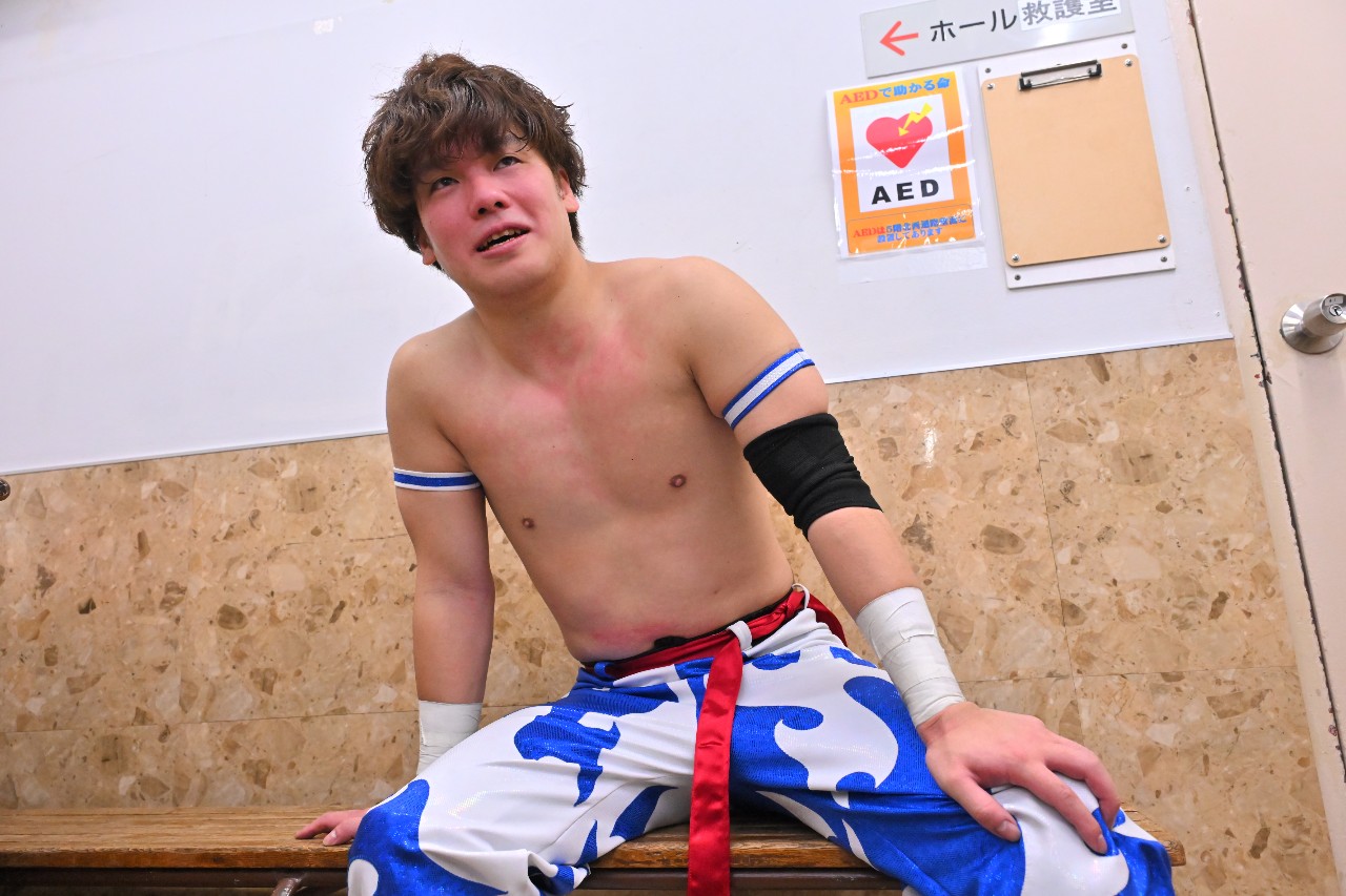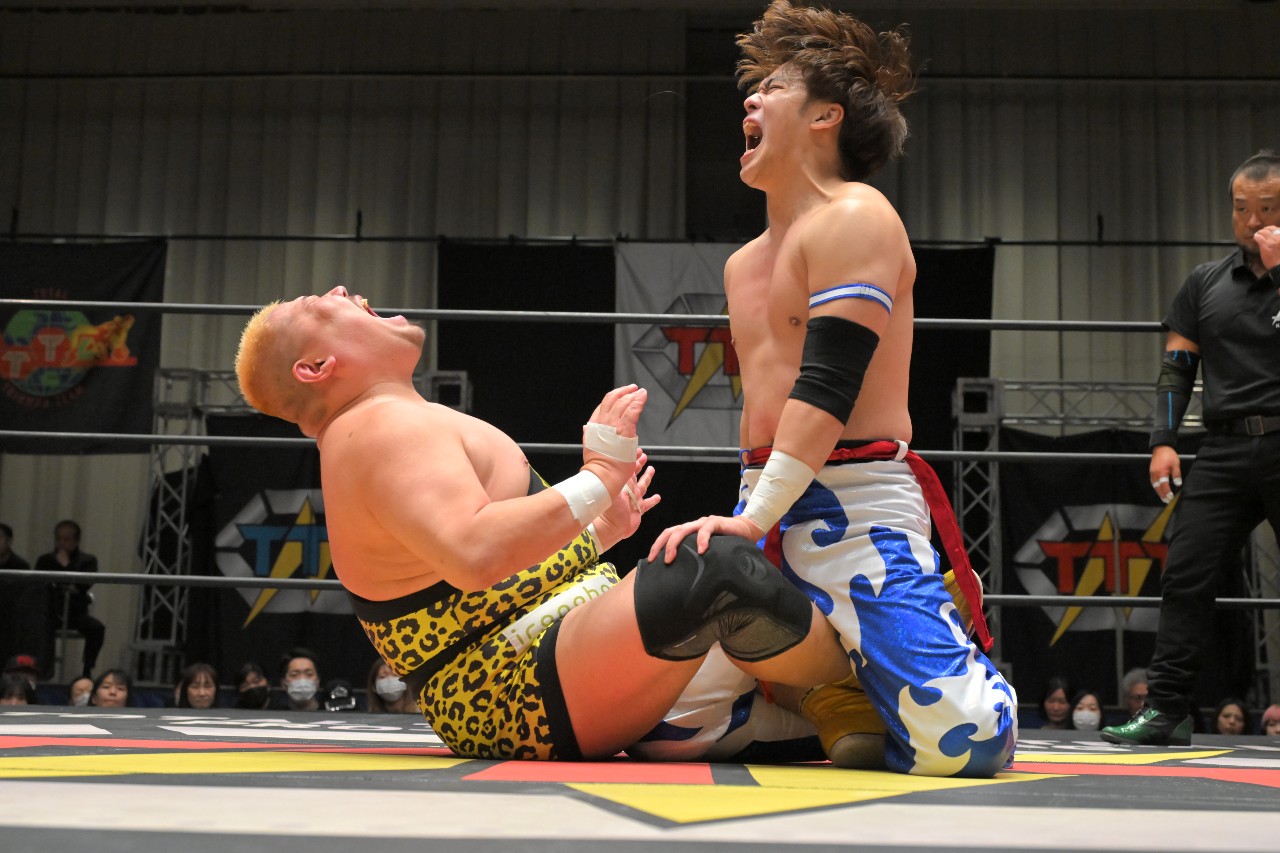 「……悔しい。悔しいね。年間最大のTTTのビッグマッチ、後楽園ホール!今日勝って2026年、僕が引っ張りたかった。ガッツさん、知ってたけど強いです。強すぎる!強すぎるけど、全然諦めてないから。まだ2026年、始まったばっかり!必ず腰にベルトを巻いて、TTTを引っ張って、もっと上にTTTを持っていきます!みんな、TTTを見てください!お願いします!ありがとうございましたッ!」