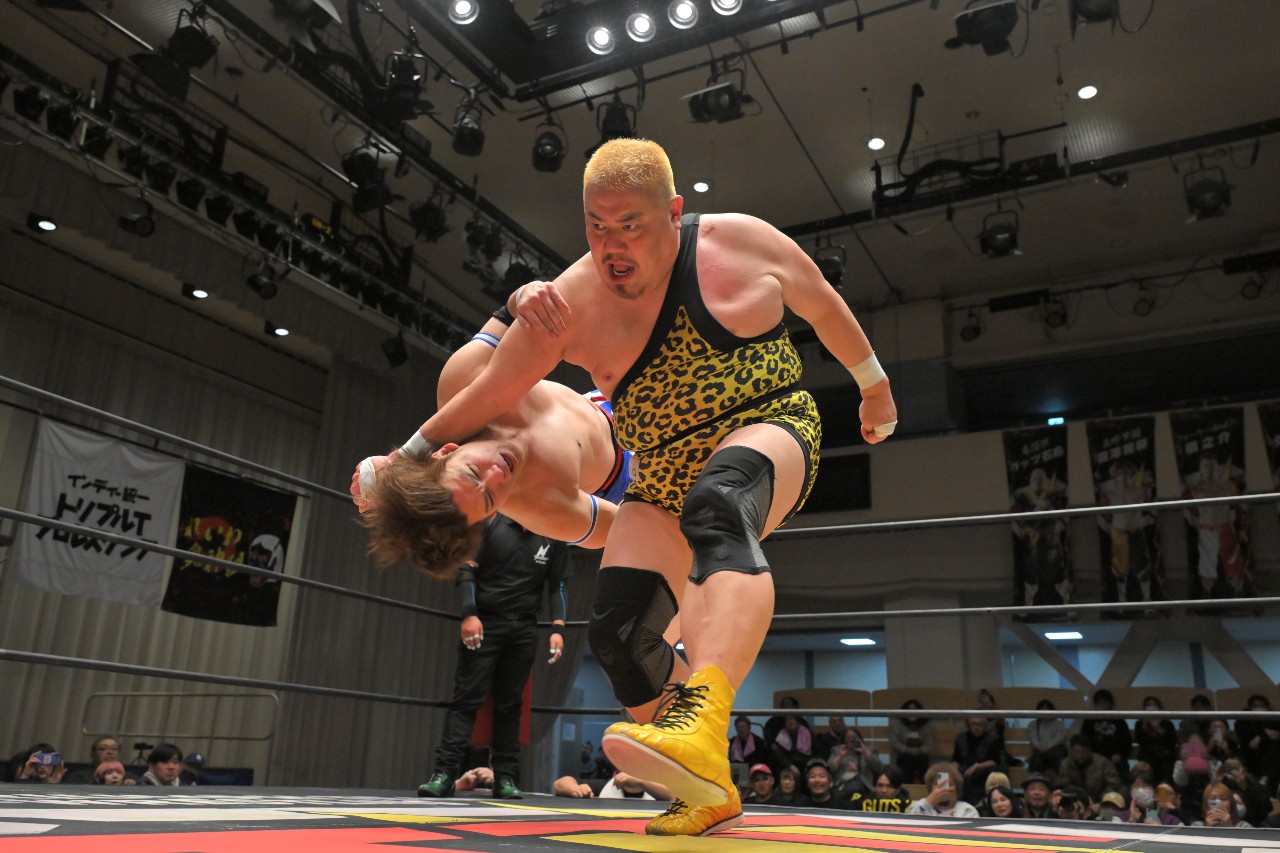 川上がエルボー連打からボディスラム、ギロチンドロップと連撃。宗達にタッチ。