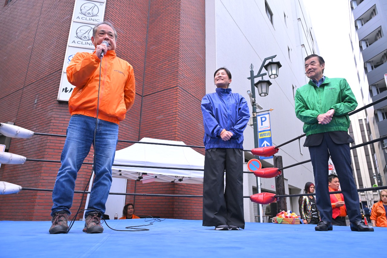 巣鴨大鳥神社商店街の平野晶子副会長、末広通り商店会の石川国由会長、文京ガーデンテナント会の杉田明治副会長が登壇。代表して石川会長が挨拶。