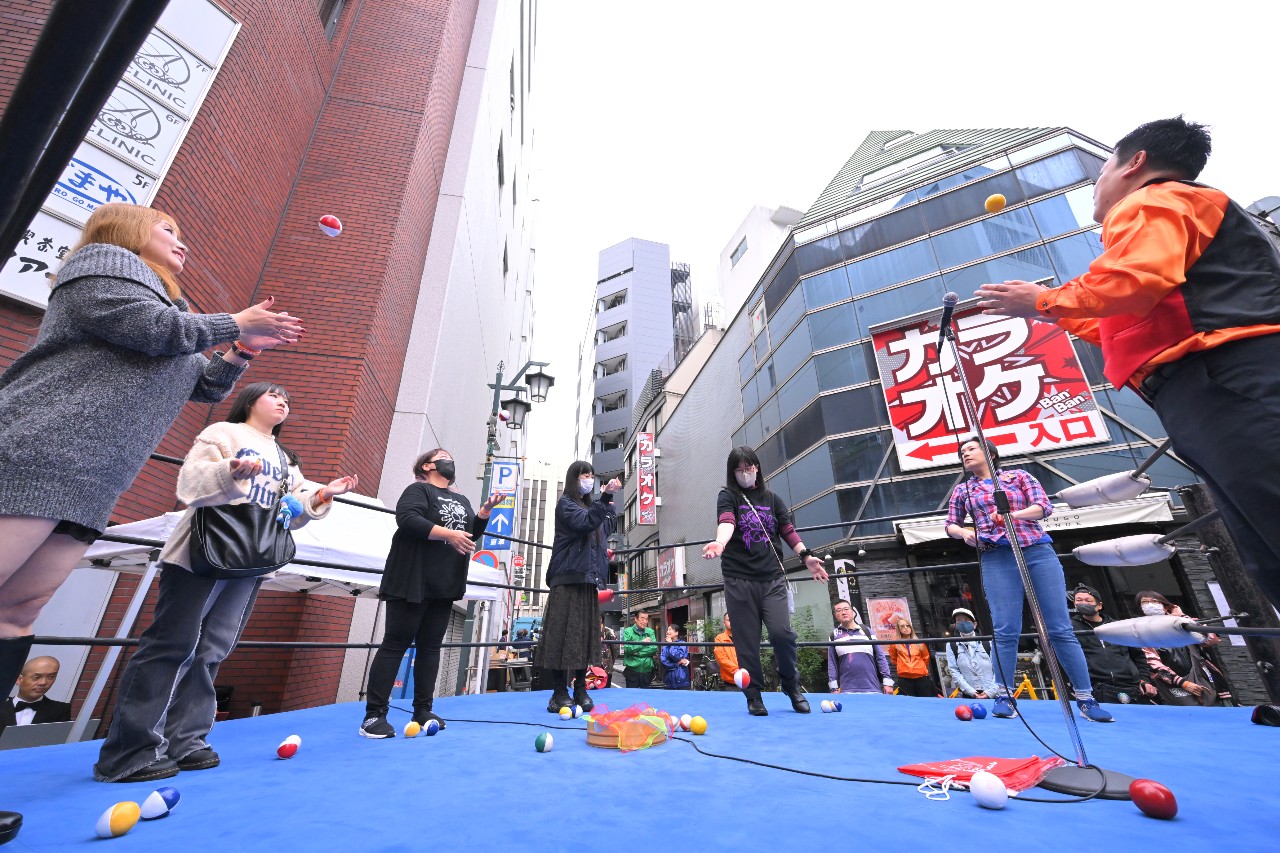 まずはストレート松浦さんによるお手玉教室のコーナー。観客がリングにあがりすぐにできるお手玉の技術が松浦さんにより教えられ、盛り上がる中で大道芸ステージがスタート。