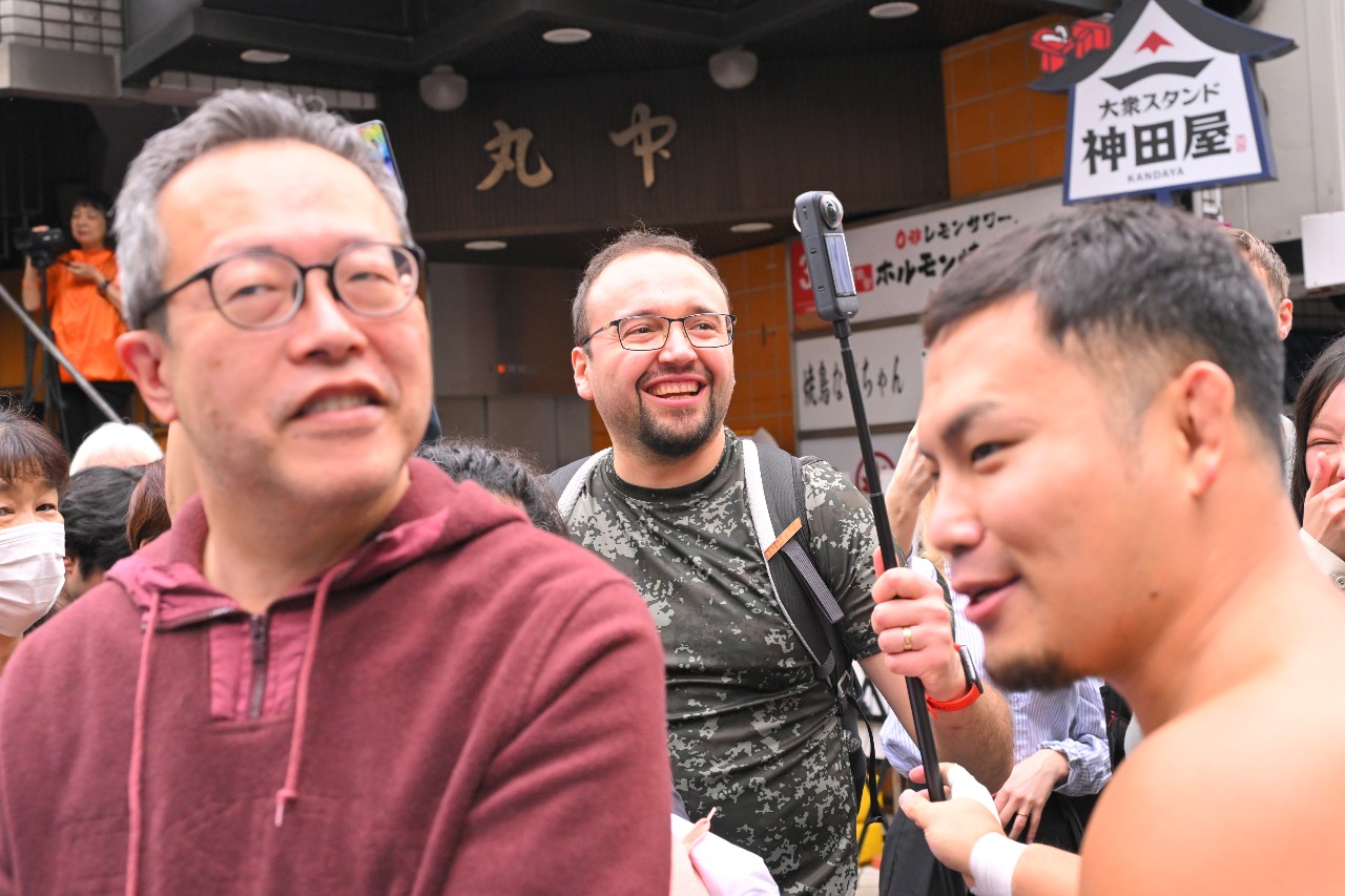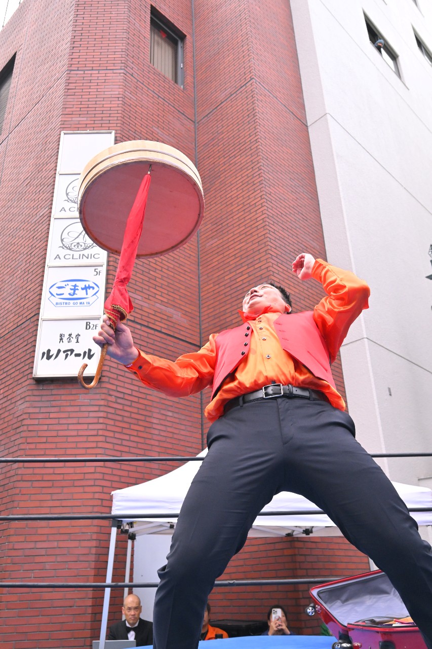 石川会長「皆さんおはようございます!こんないっぱい集まっていただきまして、ありがとうございます。10月から始まりましたアクロバトル商店会なんですけど、11月1日末広通り商店会で行いまして、12月7日文京ガーデンテナント会という、地下鉄春日駅の真上でまた同じようなことをしますので、皆さん1時から。1時。覚えておいてください。14時という情報が回ってるかもしれませんけど13時から、春日駅の真上です。開催いたしますので、よろしくお願いします。あとですね、スタンプラリーというのをやっておりまして、ある場所を言います。そこの掲示板と、そこの選手が出てくるお店の掲示板。もう一つちょっと向こうの方の掲示板。ここの3つで集めていただければと思います。それでは、アクロバトル商店会フェス2025始まります。よろしくお願いします」