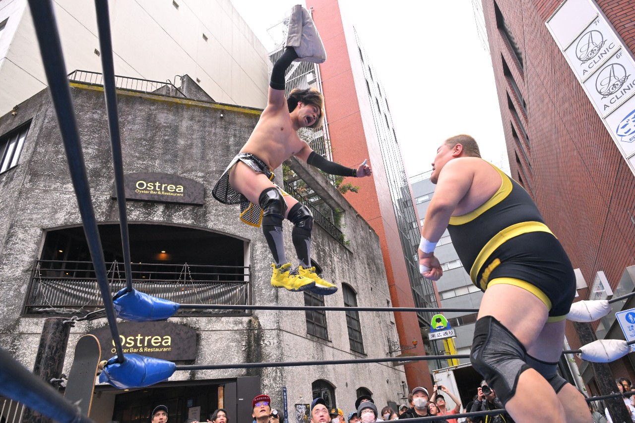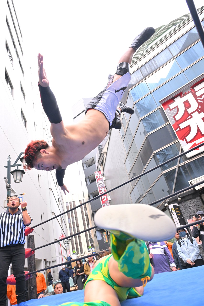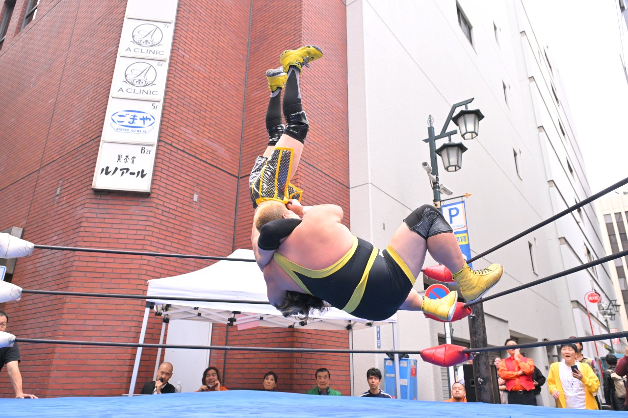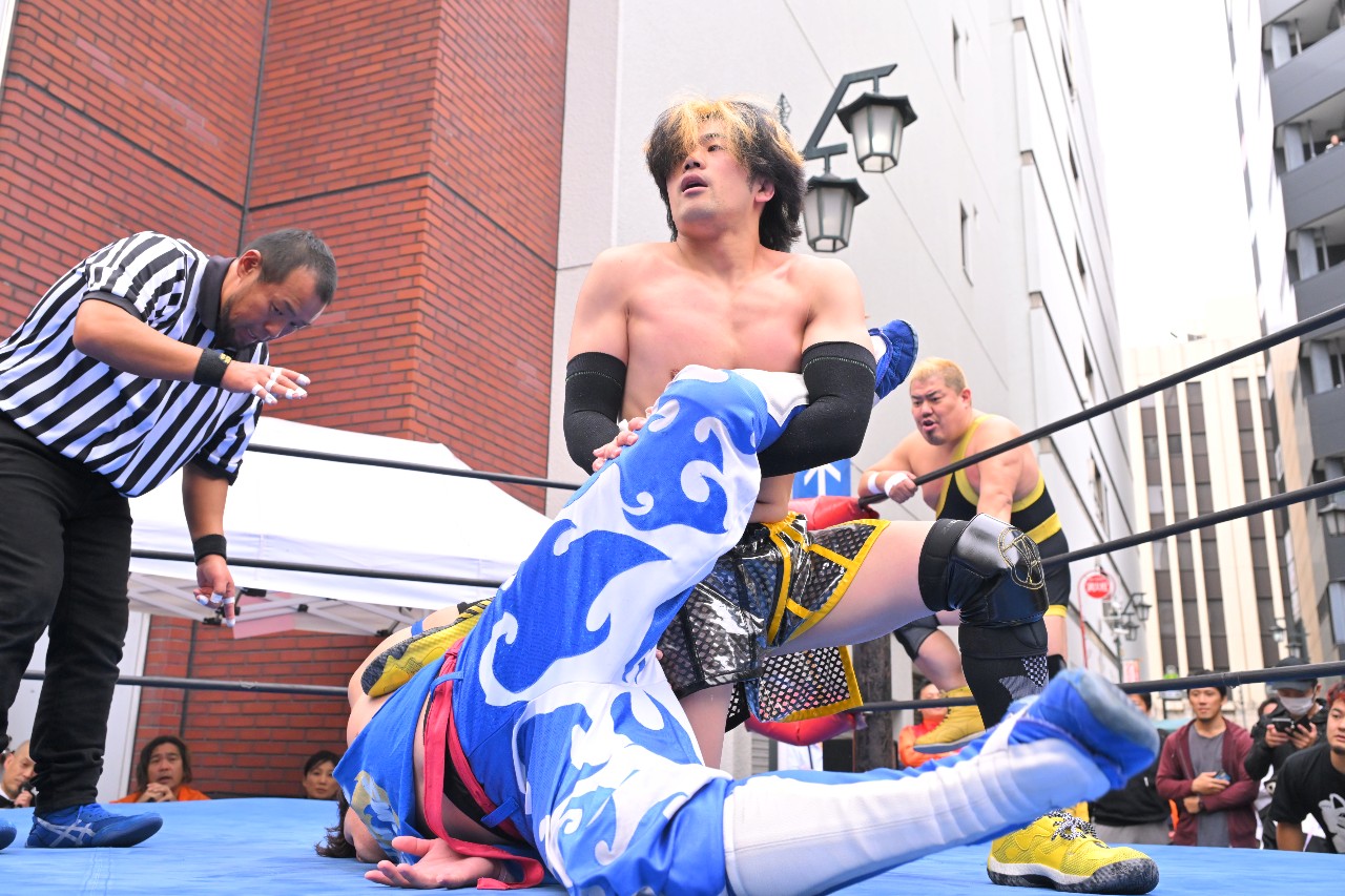 橋之介がボディスラムからコーナーに登り、スワントーンボムを投下するがツトムが避けて自爆。
