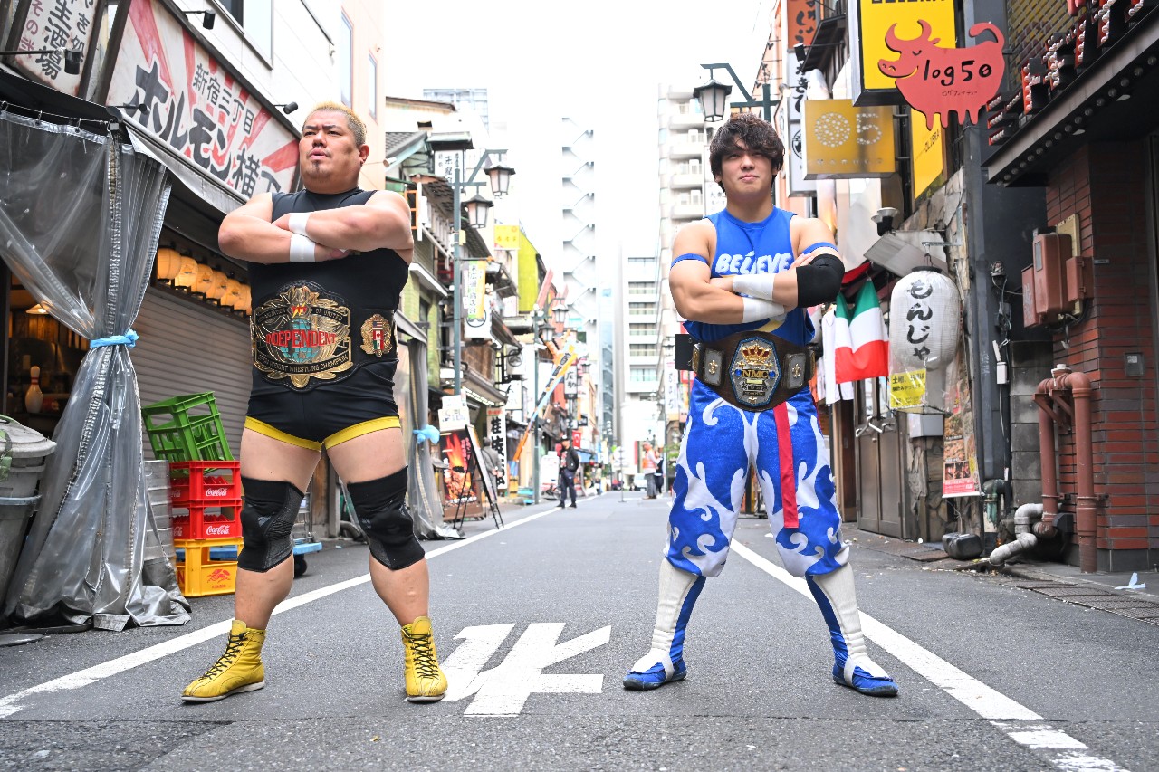 今度はアキラの腰に黒帯を巻き、ロープに振ってから帯を引っ張って引き込むと、千賀とKURO-OBIのフライングクロスチョップが綺麗に決まる。