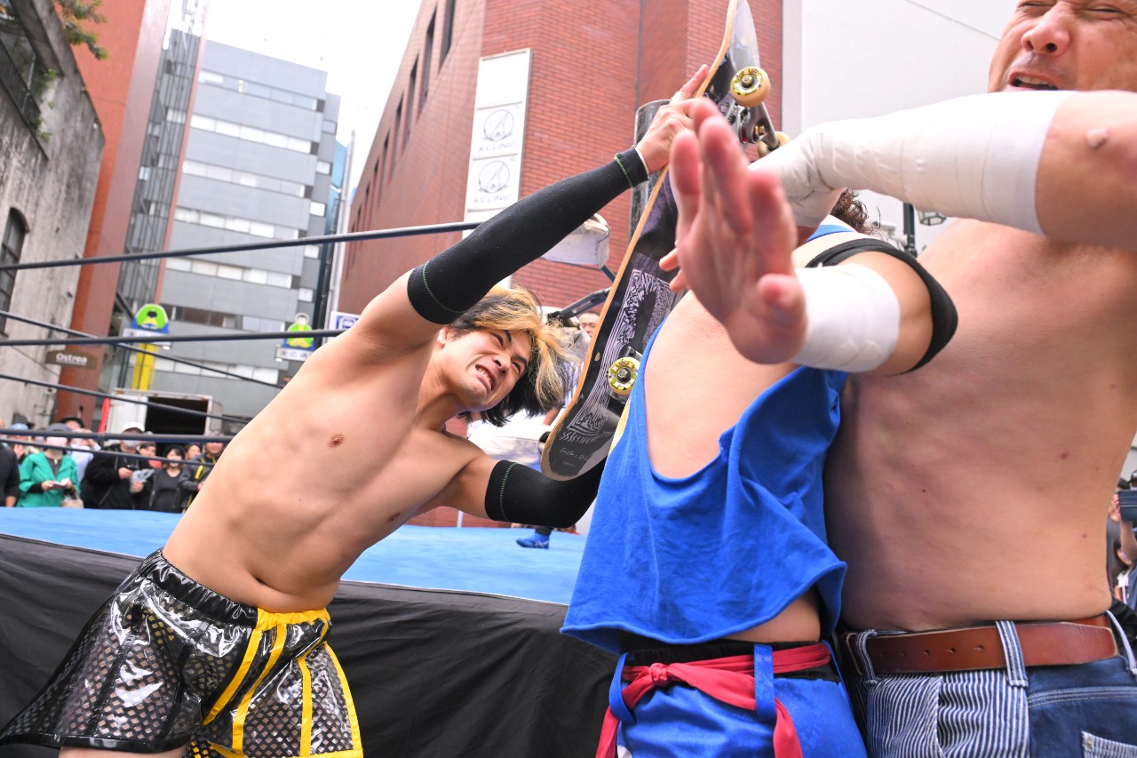 藤原は場外に投げ捨て、そのまま場外乱闘へ。瀧澤がスケボーで神崎の顔面を殴りつけ、リングに投げ入れると藤原がナックル連発。さらに背中にエルボーからボディスラムで叩きつけ瀧澤にタッチ。