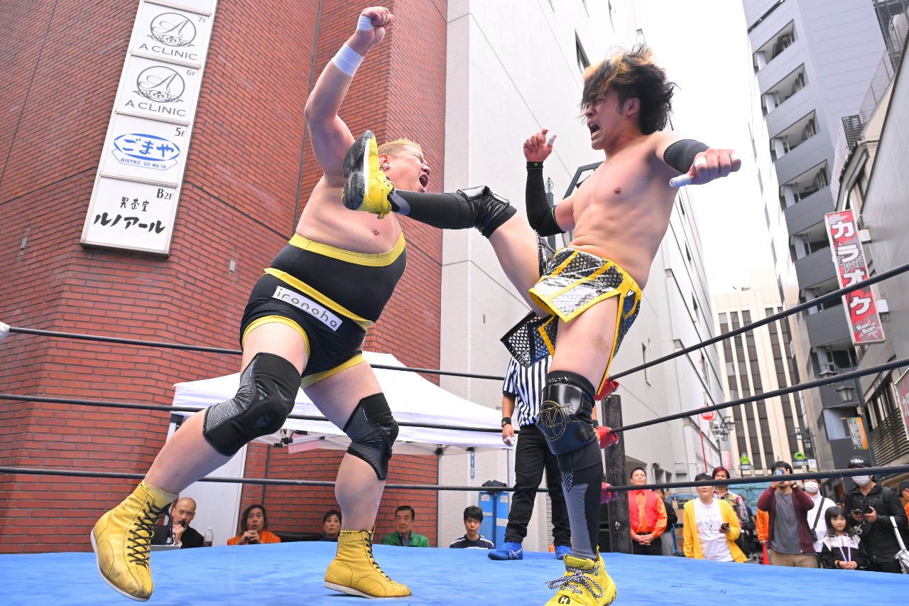 瀧澤と藤原は太鼓の乱れ打ちから瀧澤が踏みつけ、コーナーに叩きつけ藤原にタッチ。