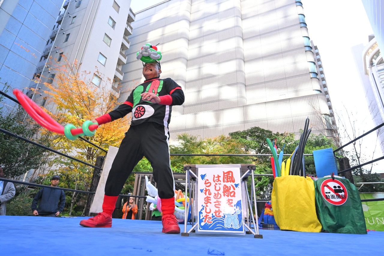 バルーンで作られた仮面ライダーのマスクを被って登場したハッピーゴリラさんは登場時から子どもたちの心をつかみ、老練で軽快なトークとともに作られていくバルーンアートに驚嘆の声が上がる。最後に見せたのは、正体不明のバルーンの球体に次々とバルーンを継ぎ足していくもの。最初こそ戸惑いの声を上げていた観衆であったが、ストッパーの役目を果たしていたバルーンを引き抜くと、大空に飛翔するツルのバルーンアートが現れて大歓声を受けた。