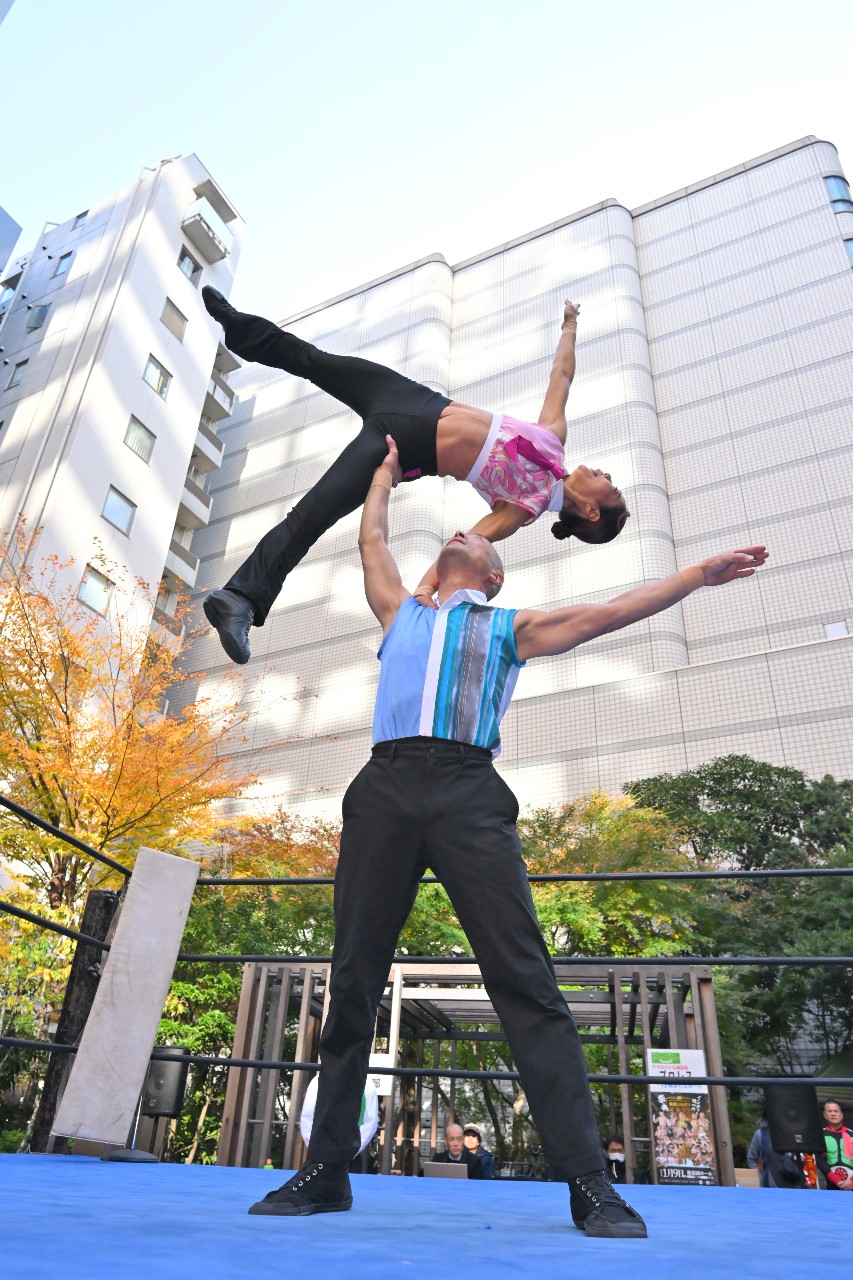次に登場したのは、サーカス出身のガッツさんと元体操選手のヨーコさんによる『サブリミット』。大道芸の大会で幾度も受賞歴を持ち、世界20ヶ国で公演してきたというハンド・トゥ・ハンドアクロバット確かな実力を持つ。
