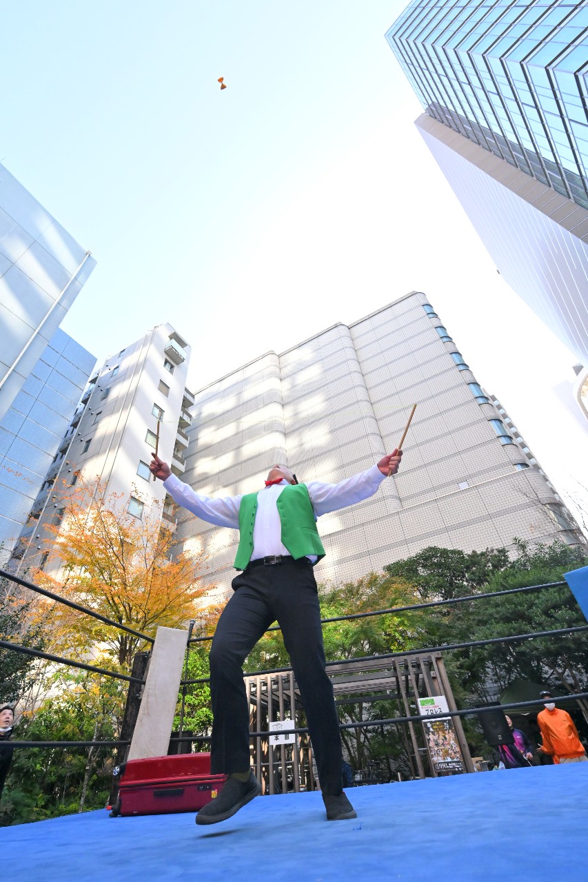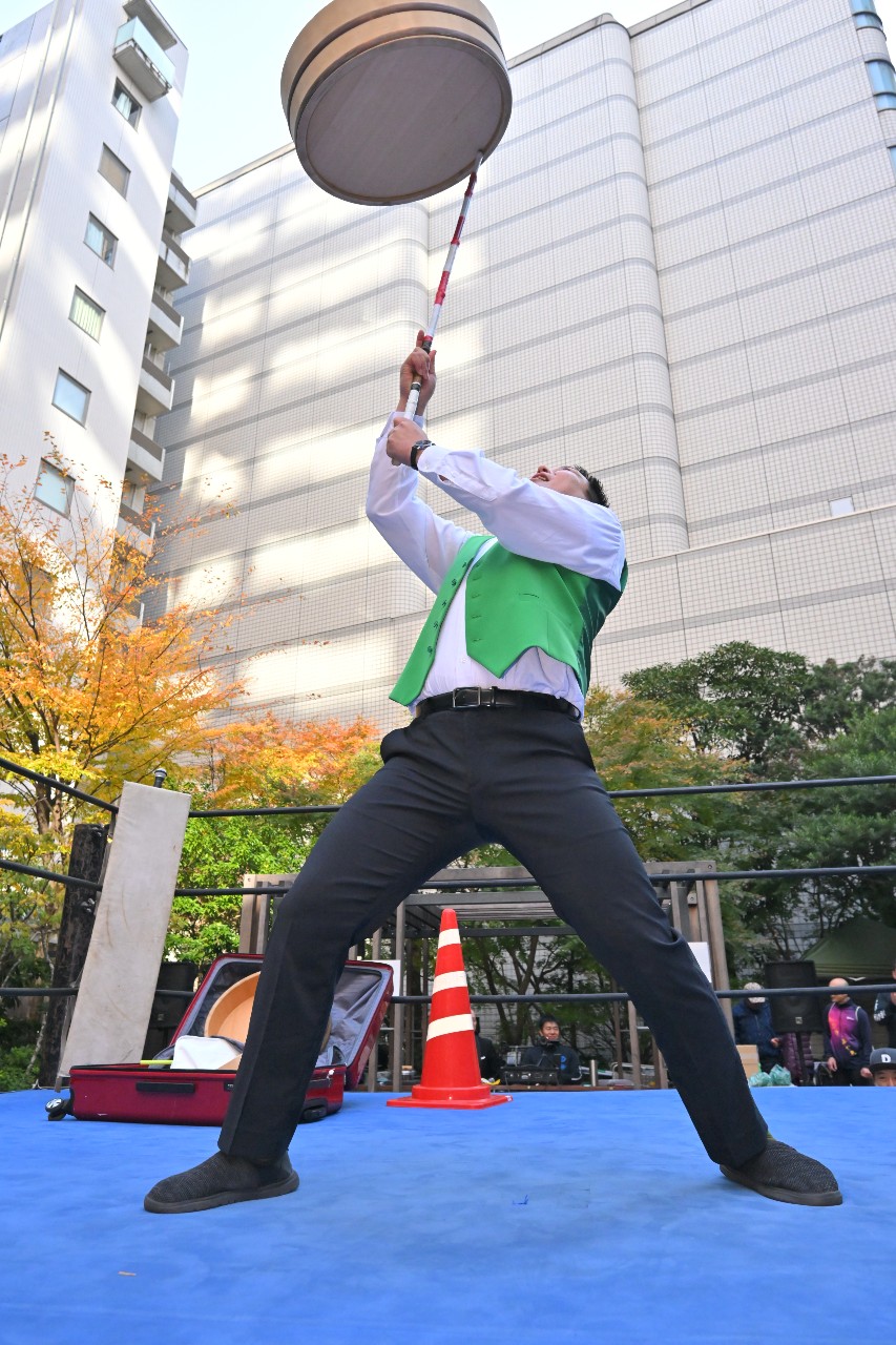 軽快なトークとともに高度なディアボロ(コマ)の技を披露し、2本の棒で交互に叩くだけであらゆるものを持ち上げていく。最後に行われた桶回しでは、市販では最大サイズの超巨大桶を棒1本で回して見せ、大喝采を受けた。