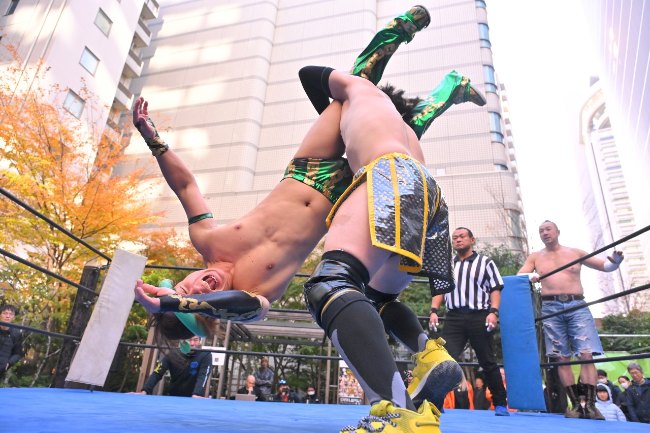 橋之介がコーナートップに上がってスワントーン・ボムを発射も、定が回避して自爆させトラースキック。ミステリーにタッチ。