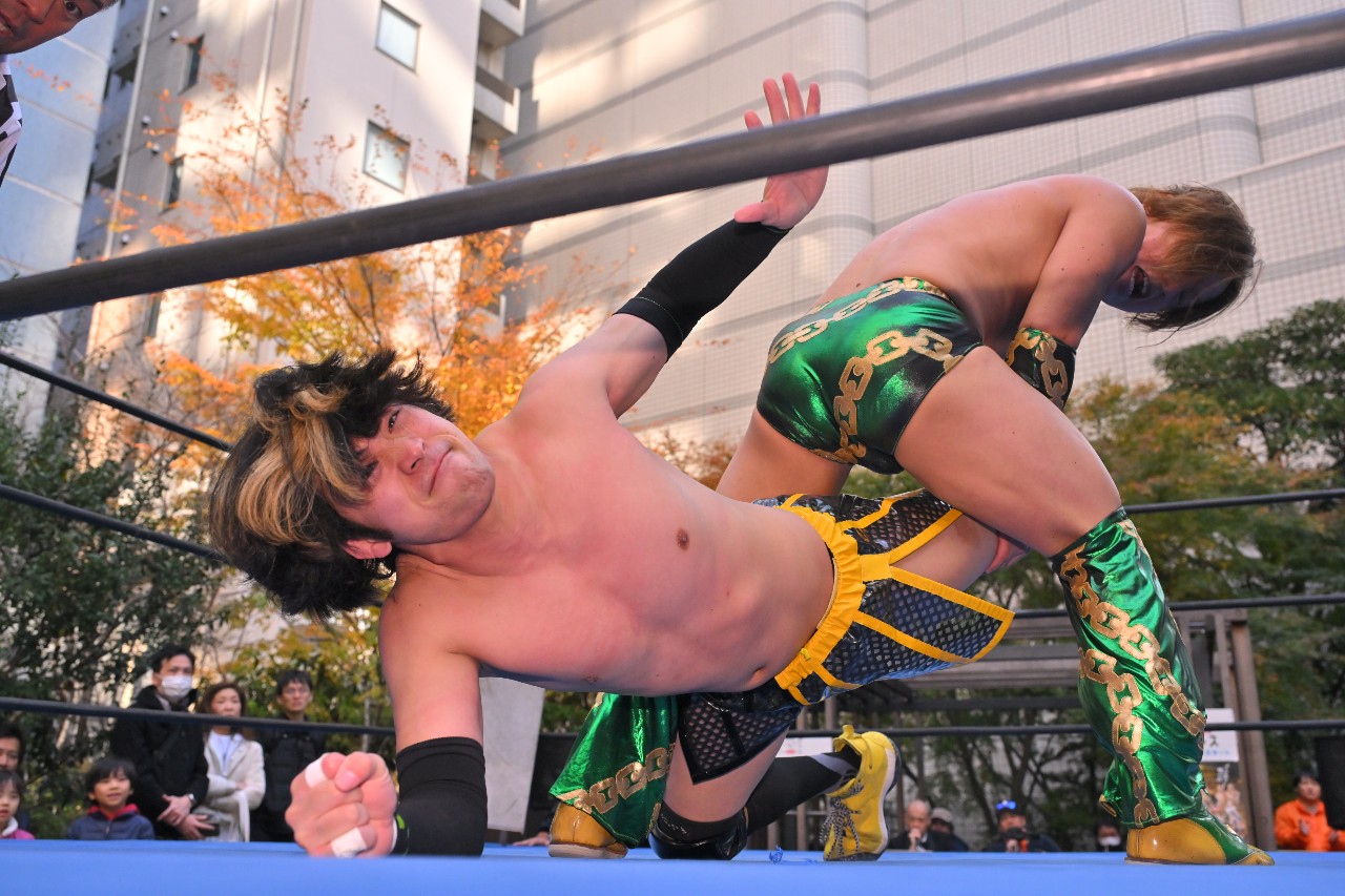 KURO-OBIが足を取るために寝転ぶと、千賀が上から押さえ込んでカバー。千賀が寝転ぶとKURO-OBIが上から押さえ込んでカバーというコミカルなやり取りが続き、クリーンブレイク。