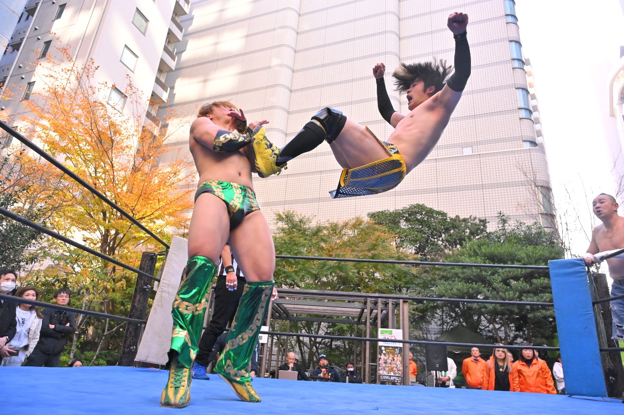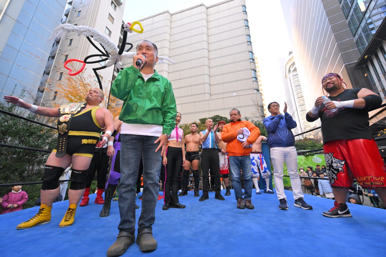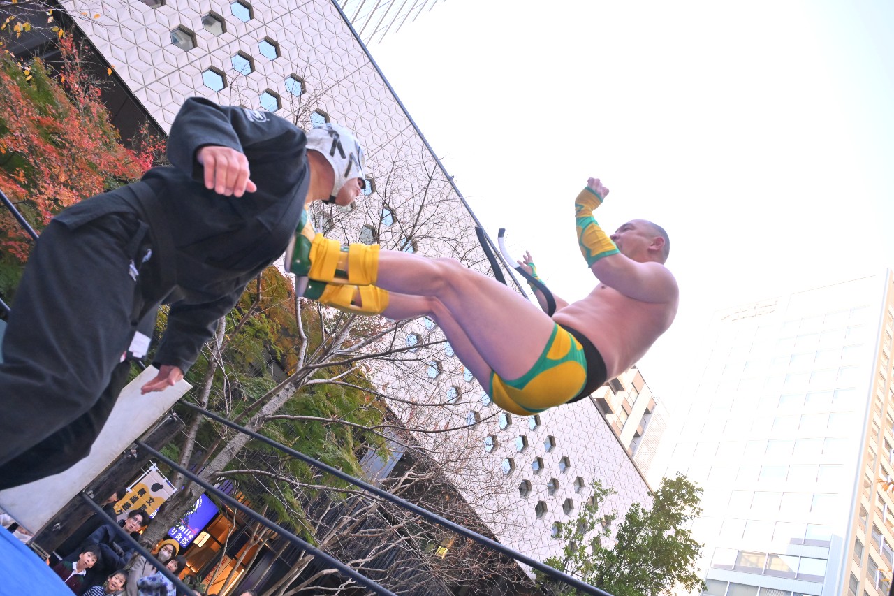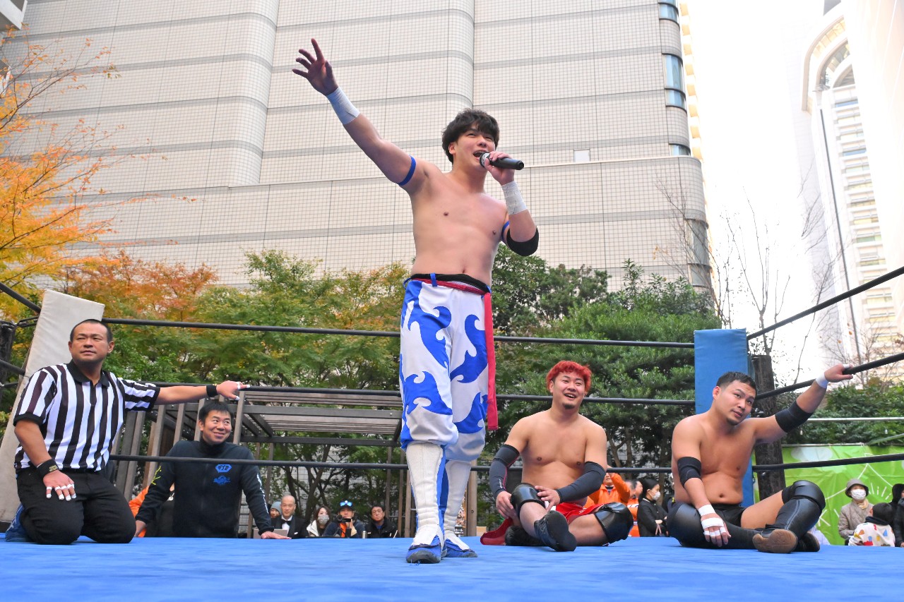 神崎「文京区の皆さん、こんにちは!今日はこの寒い中、見に来てくれてありがとうございます!実は僕、来年1月9日の後楽園ホール大会で、この黄色い太ったおじさんのベルト挑戦します!すぐそこの後楽園ホールでやるんで、皆さん応援に来て下さい!絶対ベルト獲って、またここに帰ってきます!応援してください!」