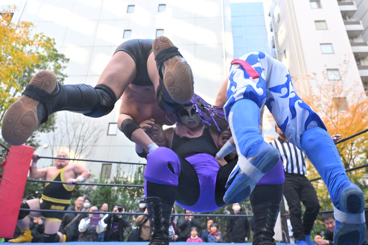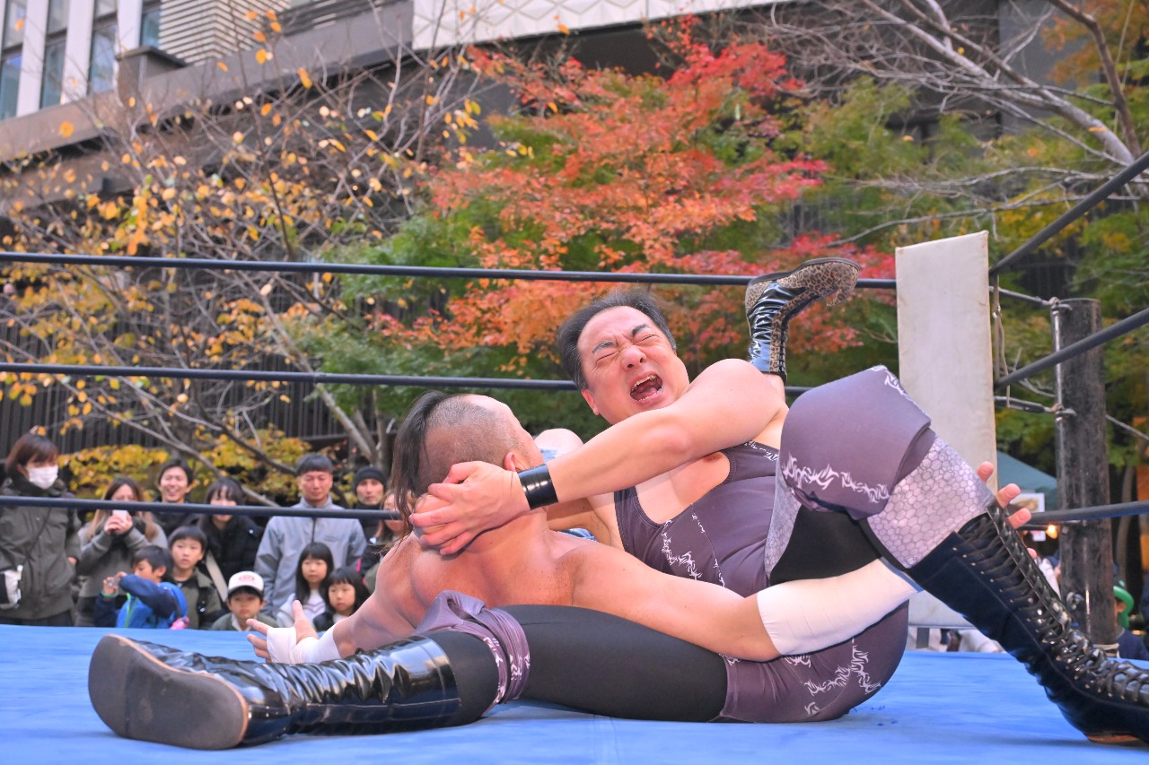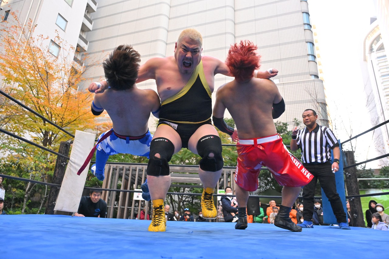 そして神崎、橋之介はコスチュームの色からそれぞれ「ブルー」「レッド」と子どもたちから呼ばれており、コワモテのガッツ&定にいたぶられる2人へ「頑張れレッド!」「やり返せブルー!」といった子どもたちの歓声が飛ぶヒーローショーのような光景が広がる。ガッツが神崎をリングに戻してバックエルボーで倒し、ミステリーにタッチ。