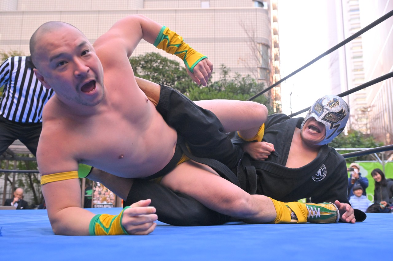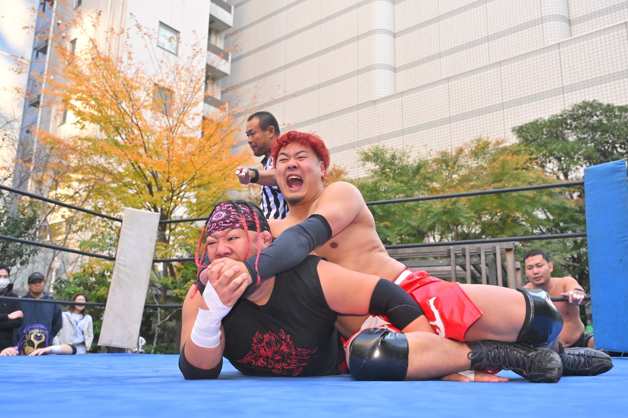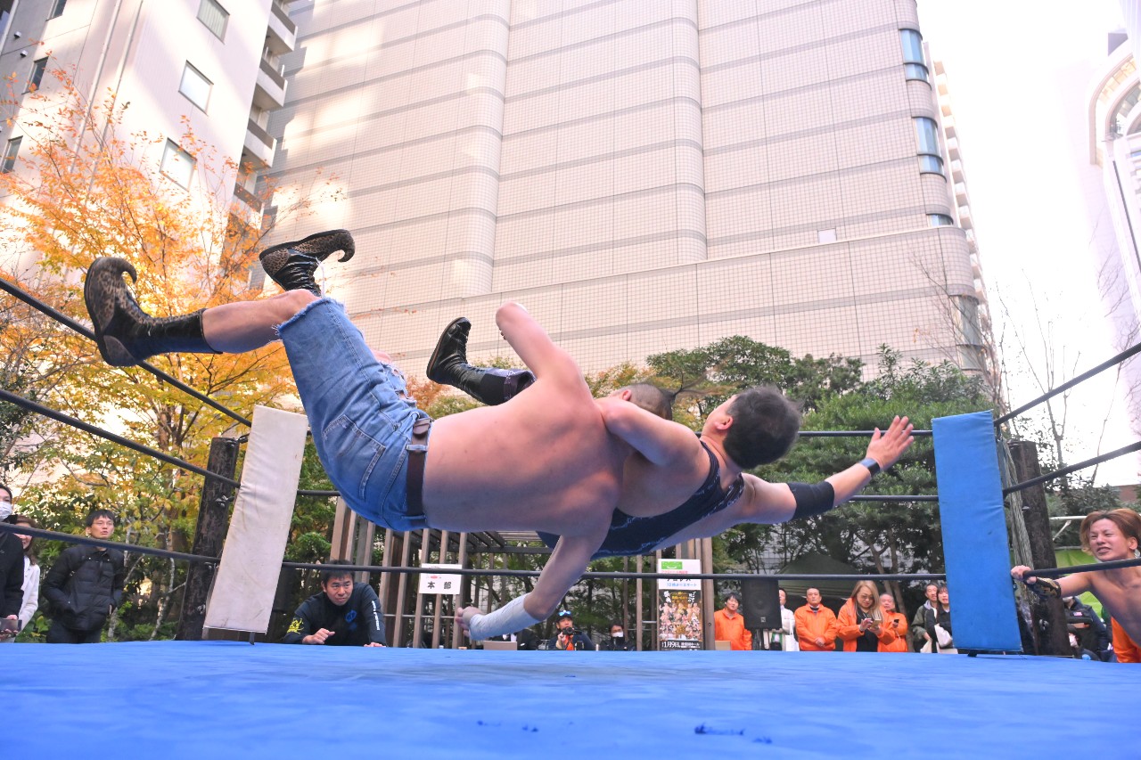 ともに6人タッグ王座を持つ【黒帯軍団】の千賀とKURO-OBIのシングルマッチ。商店会プロレスといえばこの2人の謎の因縁シングルマッチという側面があったが、タッグパートナーとなった今回は違った趣を感じさせる。