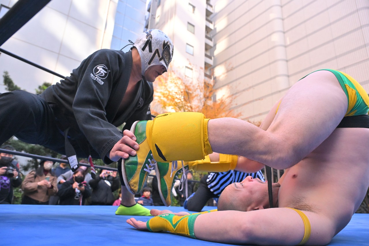 ゴングが鳴ると素早いバックの取り合いから千賀が先にグラウンドに寝て下から足を絡め取ろうとする。KURO-OBIもしっかりこれに対応し、先にアキレス腱固めを極めるテクニシャンぶりを見せる。
