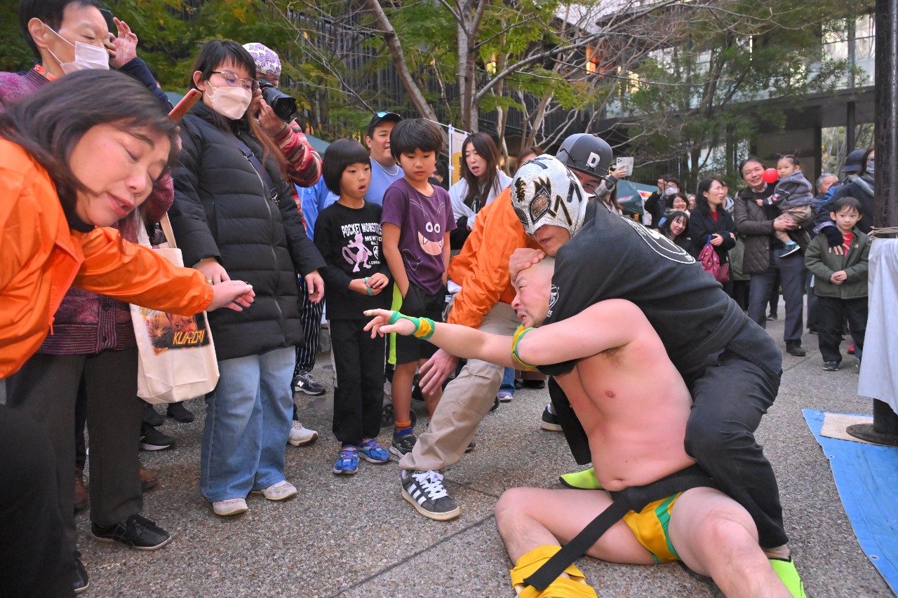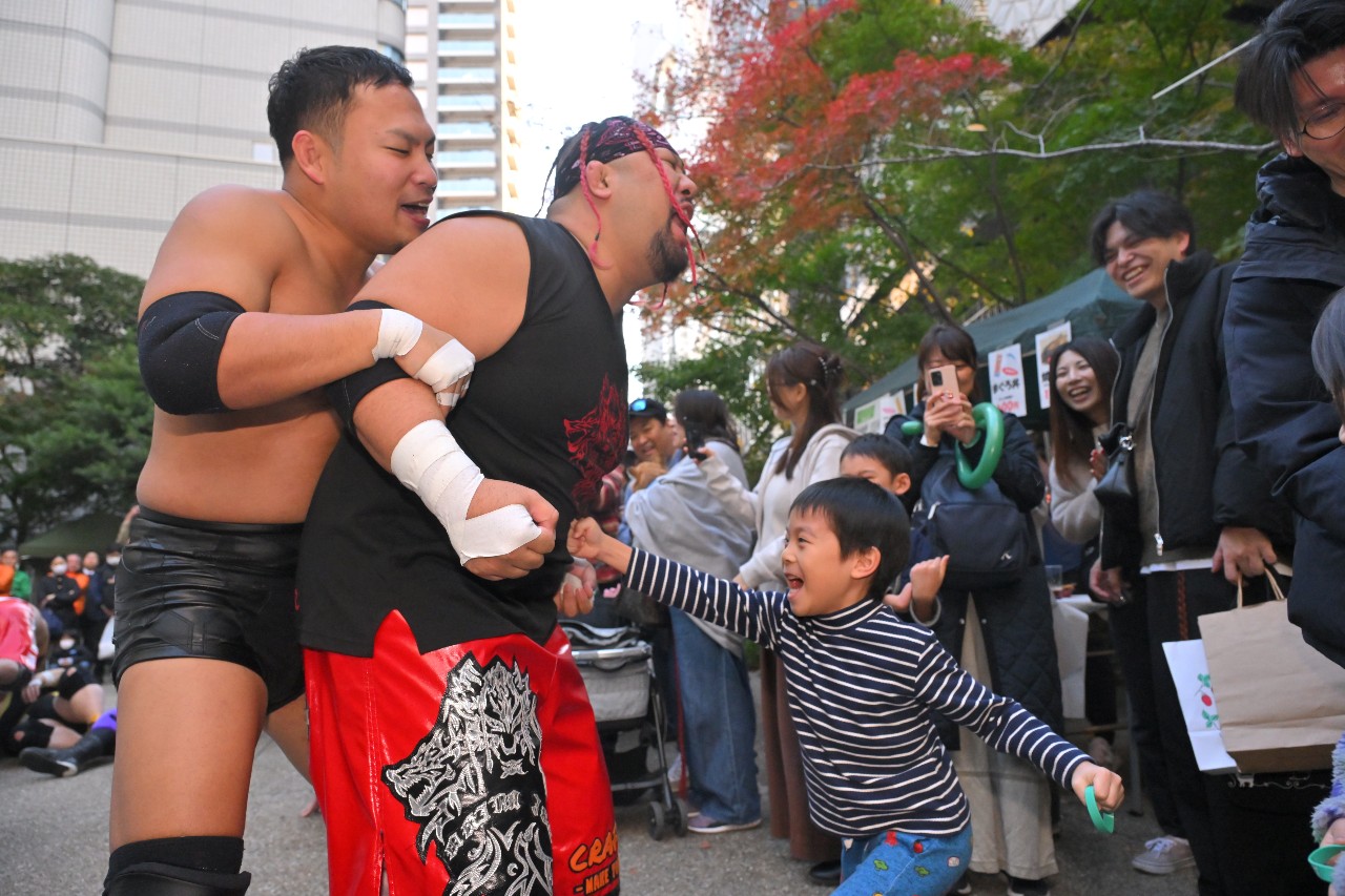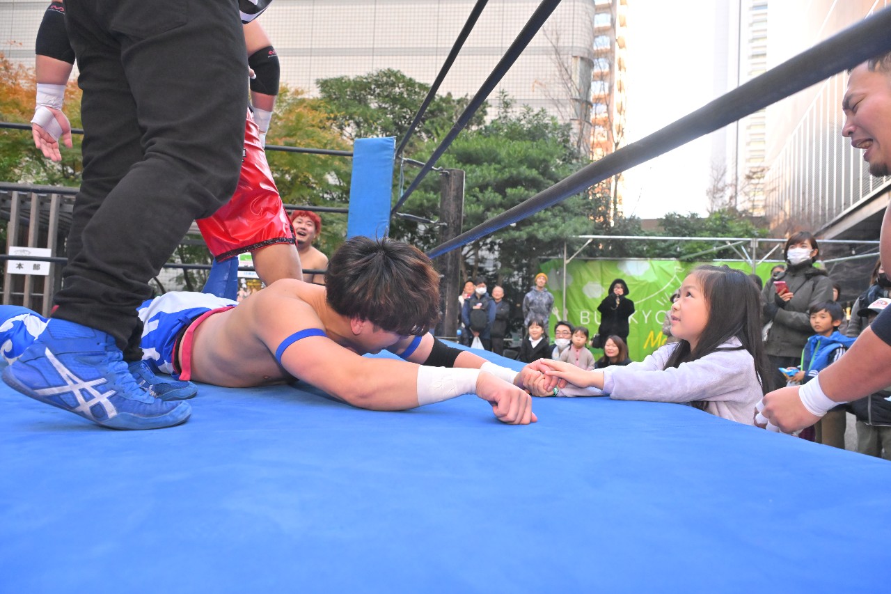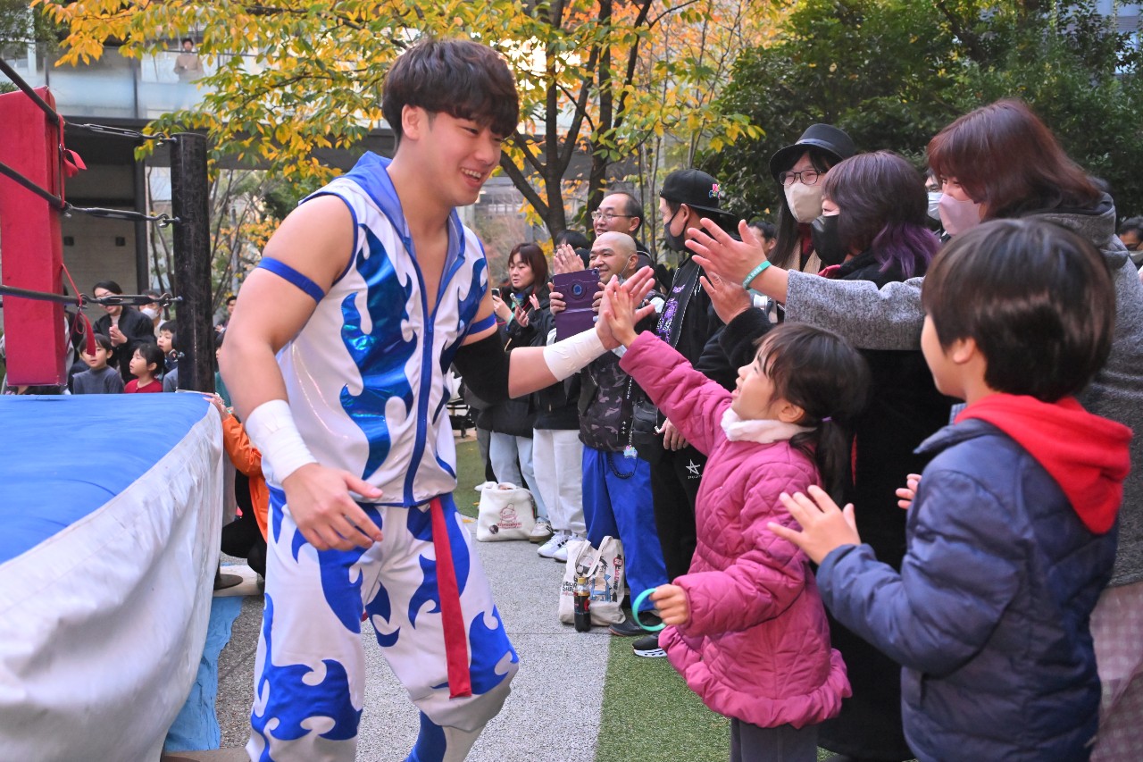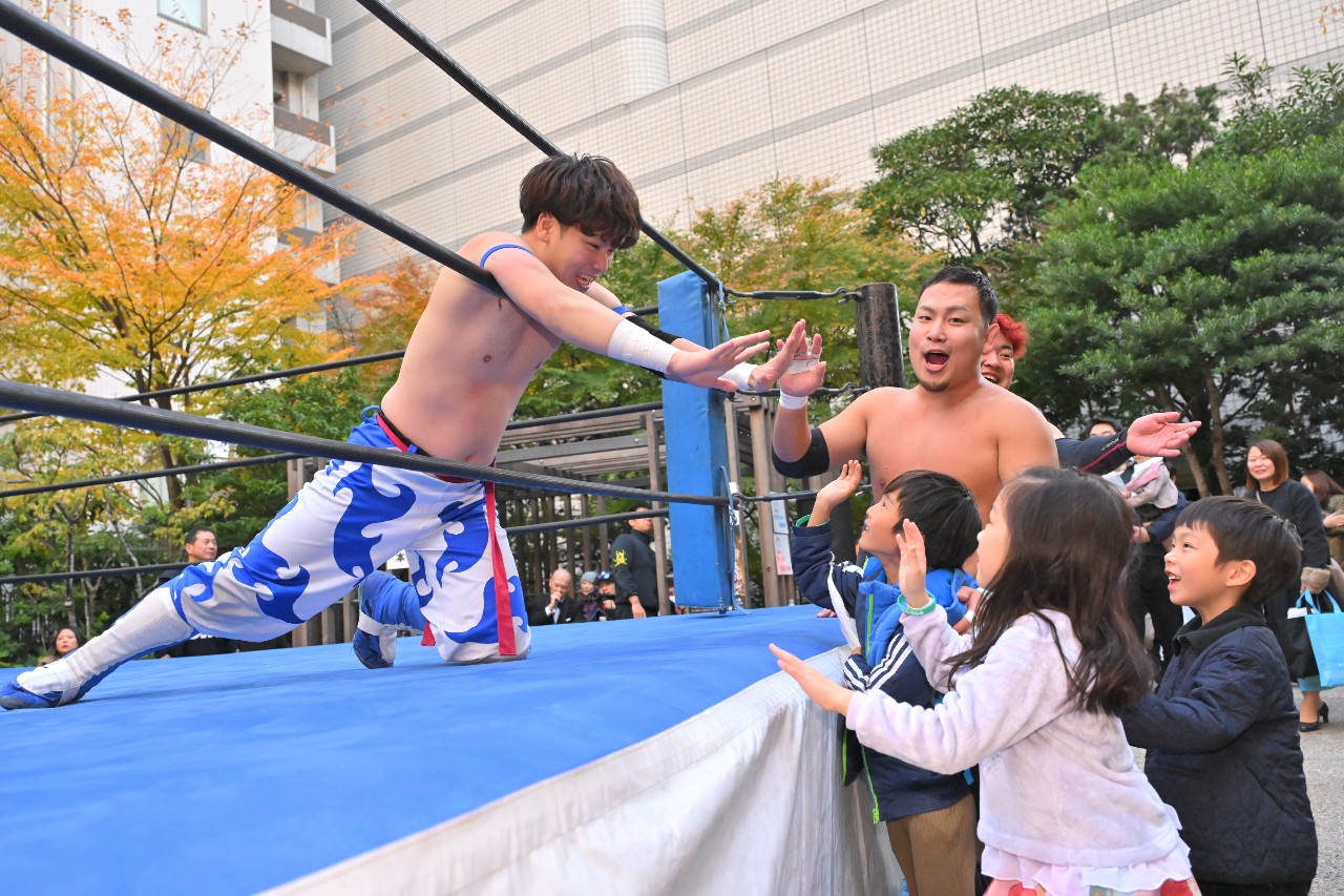 今回は観衆のほとんどが未就学児~小学校低学年程度のお子さんのいる家族連れであったため、十数名のお子さんがこぞって参加。初めて立つプロレスのリングで跳ね回ったり、お手玉に夢中になって一生懸命な姿は大人たちの心に癒やしを与えた。