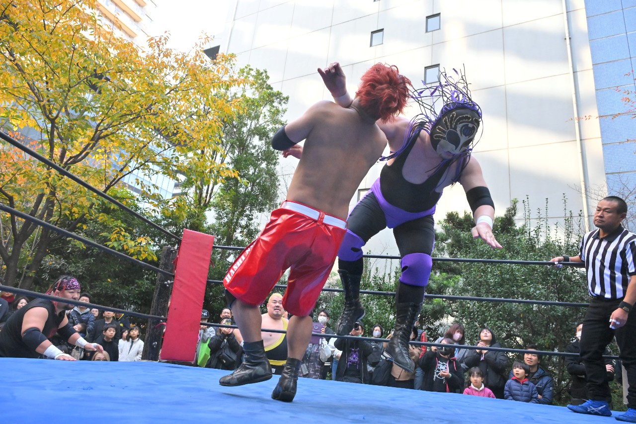 ミステリーはコーナーに飛び乗って橋之介へダイビング・ラリアット。さらに串刺しバックエルボーからブレーンバスター、セントーン・アトミコと連撃。子どもたちから「レッド頑張れ!」の声が飛ぶ中、橋之介は奮起してエルボー連打から打点の高いドロップキックを決めて窮地を脱出。神崎にタッチ。