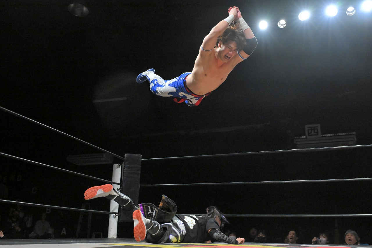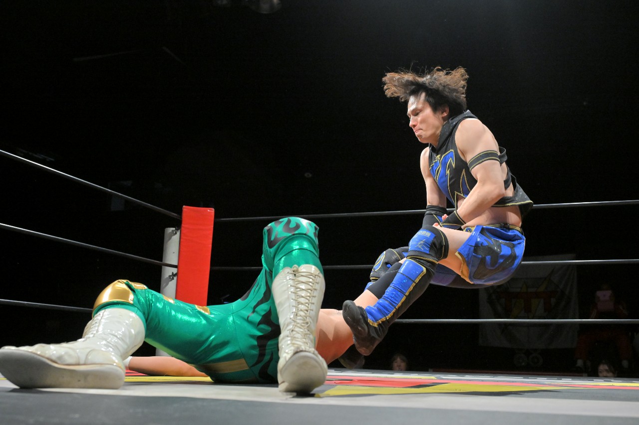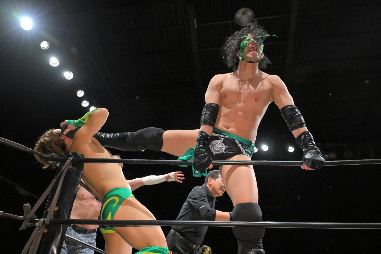 刃は左腕へのエルボーを連打。愚直なまでに左エルボーで突っ張っていくダイスケだったが、刃はリストロックで捕らえながらヒジを蹴り上げ、コーナーを駆け上がってのスイング式アームロックDDTを狙うが、ダイスケが着地。素早くセカンドコーナーに飛び乗ってミサイルキックを見舞い、反撃の狼煙を上げる。