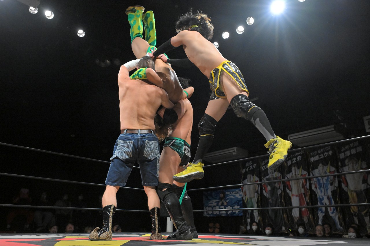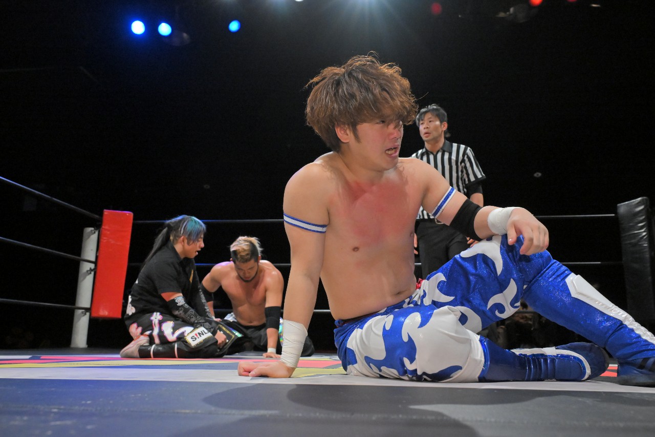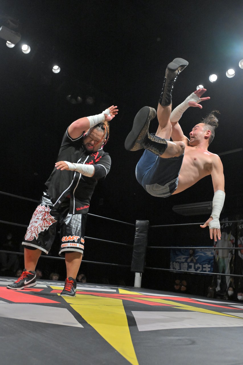 倒れず耐えた神野が橋之介にラリアットを放つが、橋之介がこれを回避。勢い余ってたたらを踏んだ神野の隙を見逃さず、神崎が組み付いて電光石火で丸め込んで3カウントを奪った。