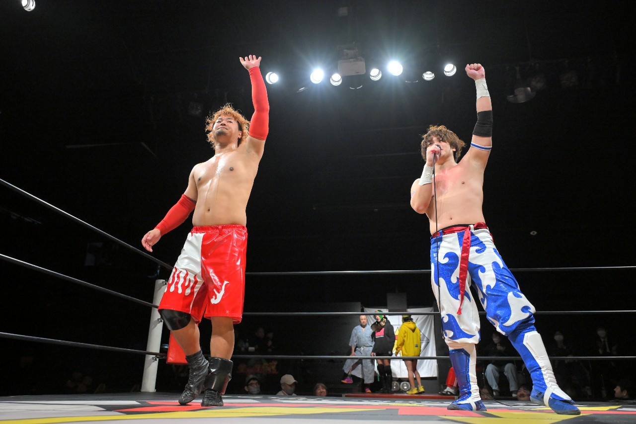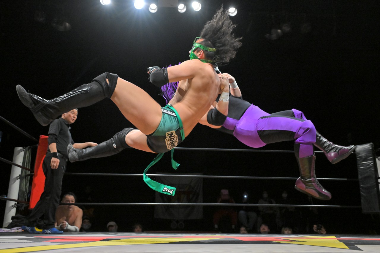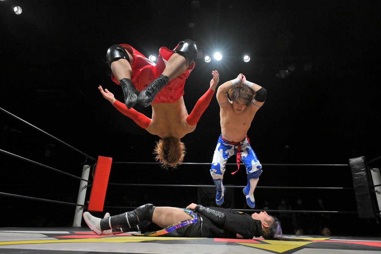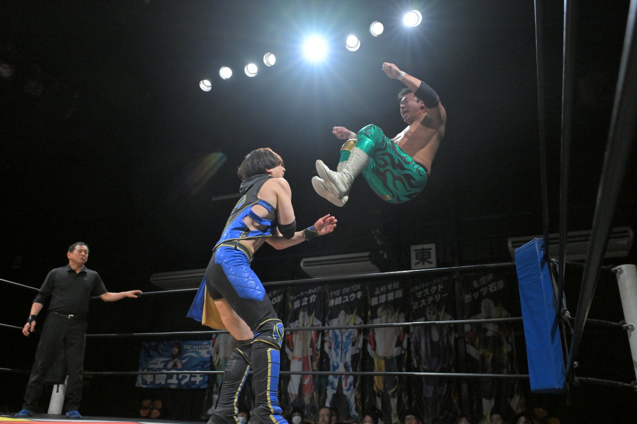 倒れず耐えた神野が橋之介にラリアットを放つが、橋之介がこれを回避。勢い余ってたたらを踏んだ神野の隙を見逃さず、神崎が組み付いて電光石火で丸め込んで3カウントを奪った。