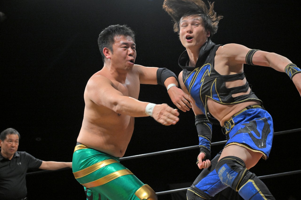 刃はランヒェイの体勢も、ダイスケが振り払って左右のエルボーを連打。これをキャッチした刃がショルダーアームブリーカー。ダイスケが怯まずランニングエルボーを狙うも刃がガード。しかし、ダイスケもその場で回転して右腕でのローリング・ラリアットを叩き込む。
