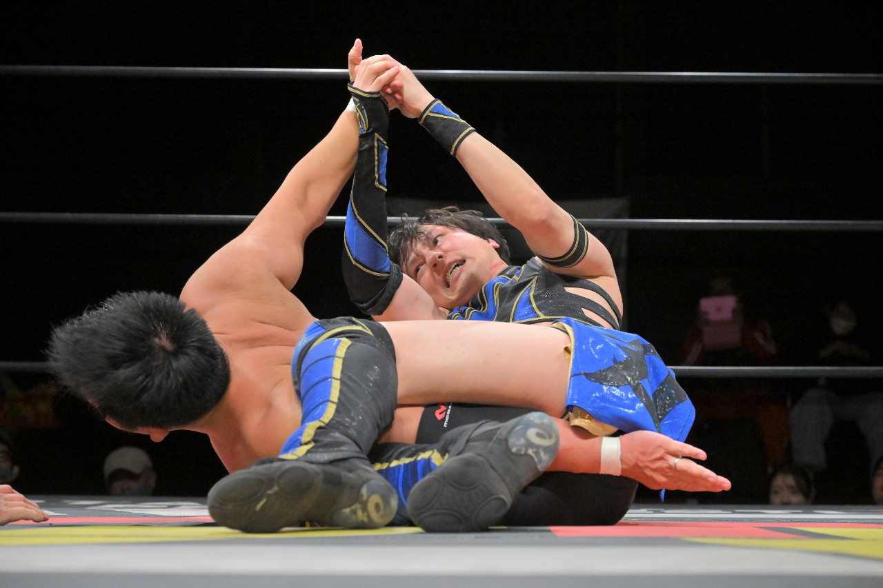 ダイスケはコーナートップに駆け上がり、フロッグ・スプラッシュ。これをカウント2で返されると、ダイスケは再びスライディングDを発射。これをキャッチして十字架固めに捕らえた刃が素早くリバース・ダブルアームバーで絞り上げると、ダイスケもたまらずギブアップ。