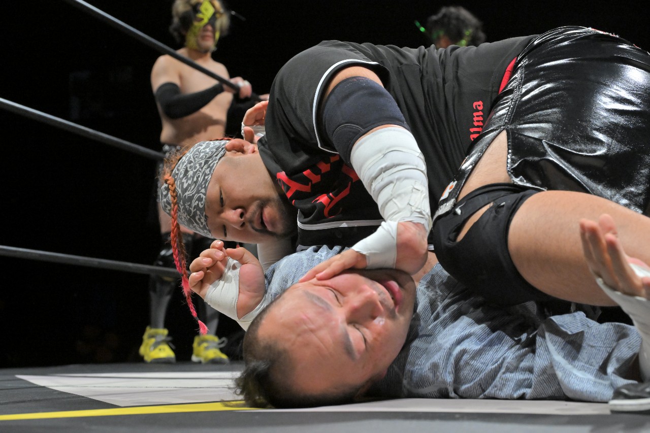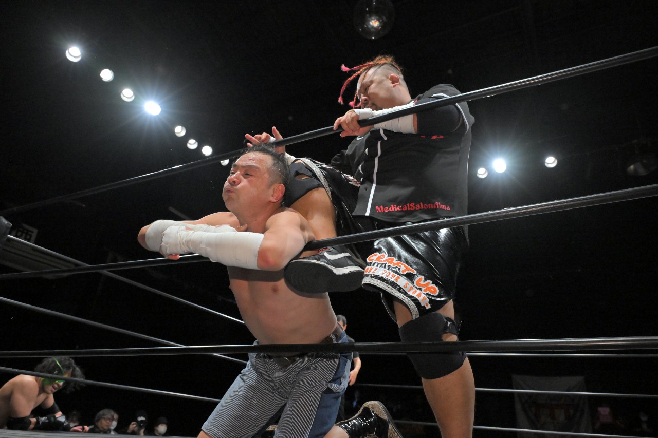 そんな佐野の隙を見逃さず、黒帯が腕十字固め。ATMがカットのためにボディプレスを放つが、これが佐野の腕ごとKURO-OBIを押しつぶす形に。