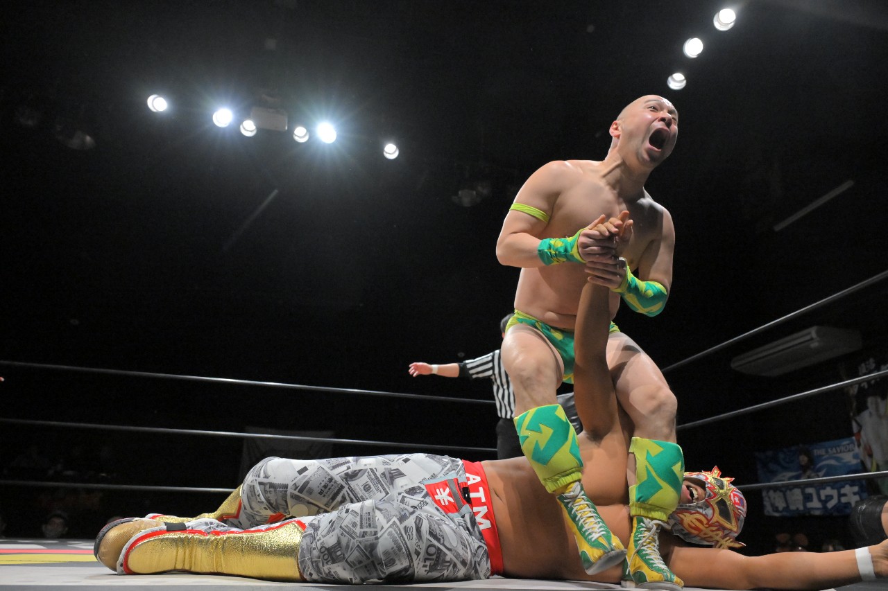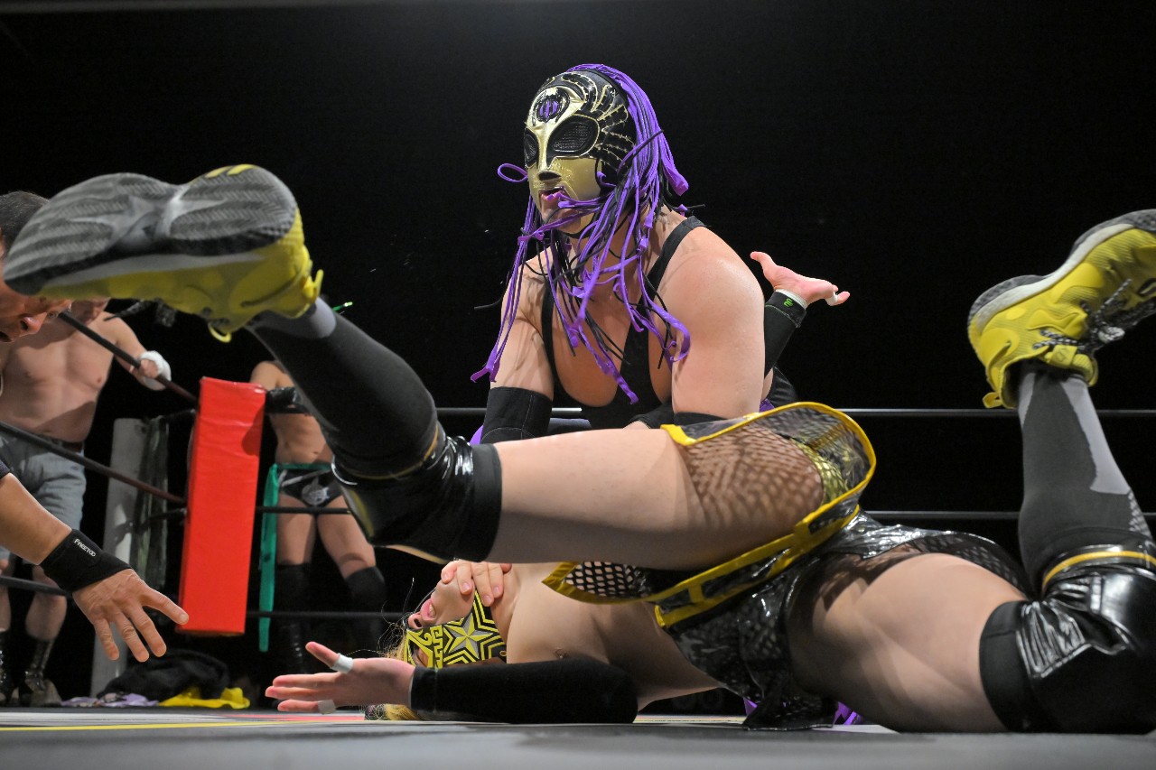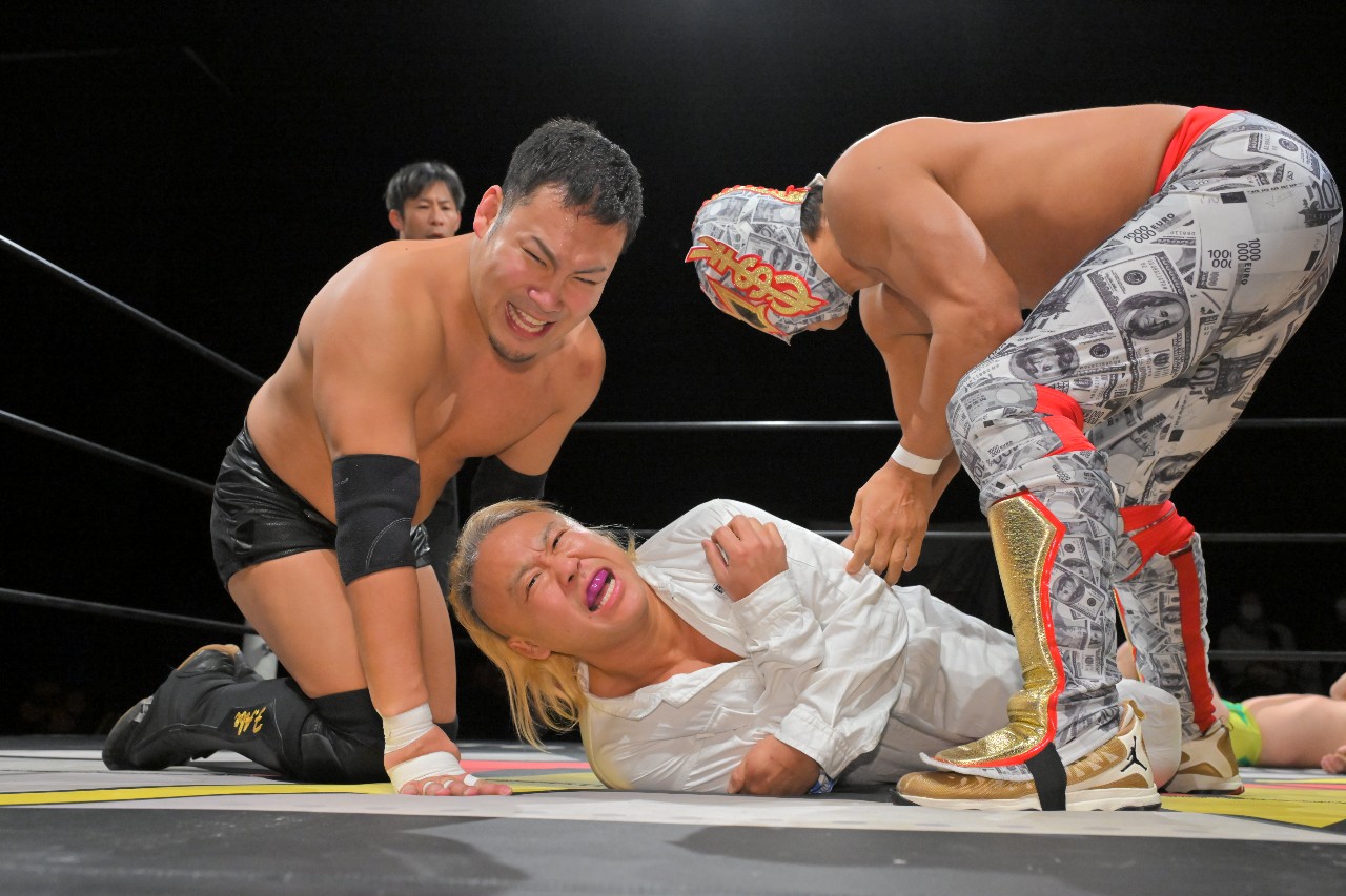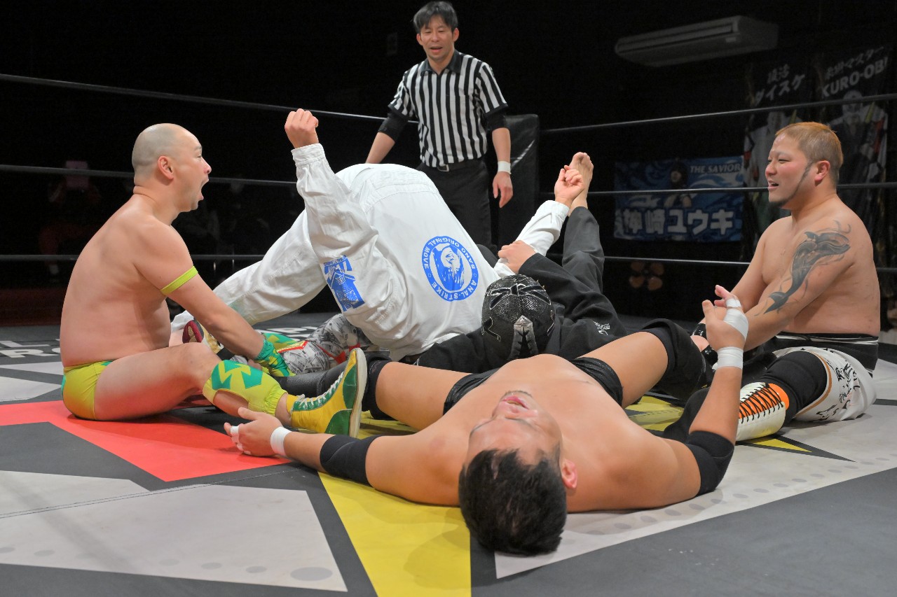 千賀&塚本が阿部&ATMをハンマースローでぶつけて倒し、それぞれアキレス腱固めに固めながらエストレージャの形に。その中央でKURO-OBIが佐野をDDTで突き刺し、令和最新型の現代アートが完成。