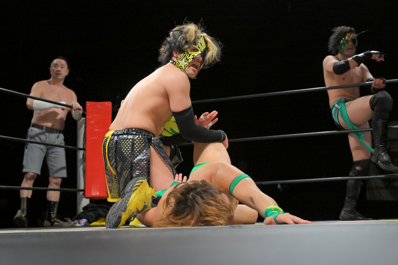代わる中野は神野との高速連携で神崎に集中砲火を浴びせ、神野のボディプレスから中野が後頭部へのエルボースタンプを連打。神崎も力なくエルボーで反撃していくが、中野が自軍コーナーに押し込んで神野にタッチ。