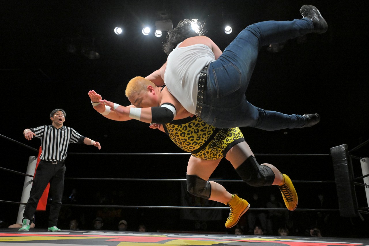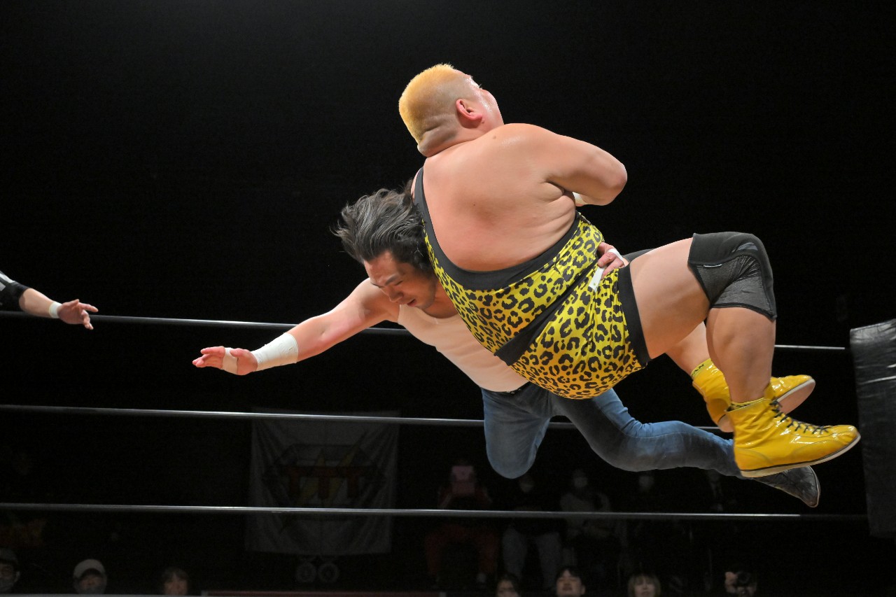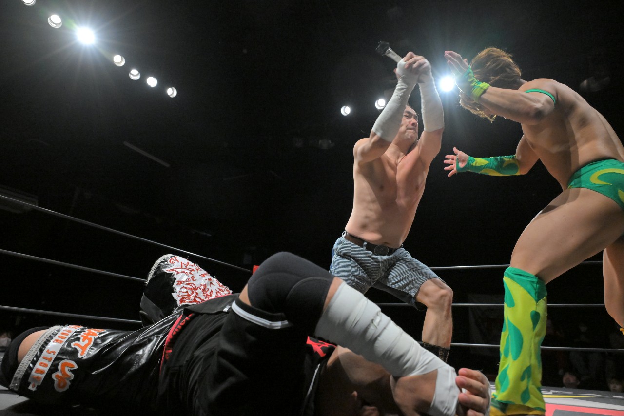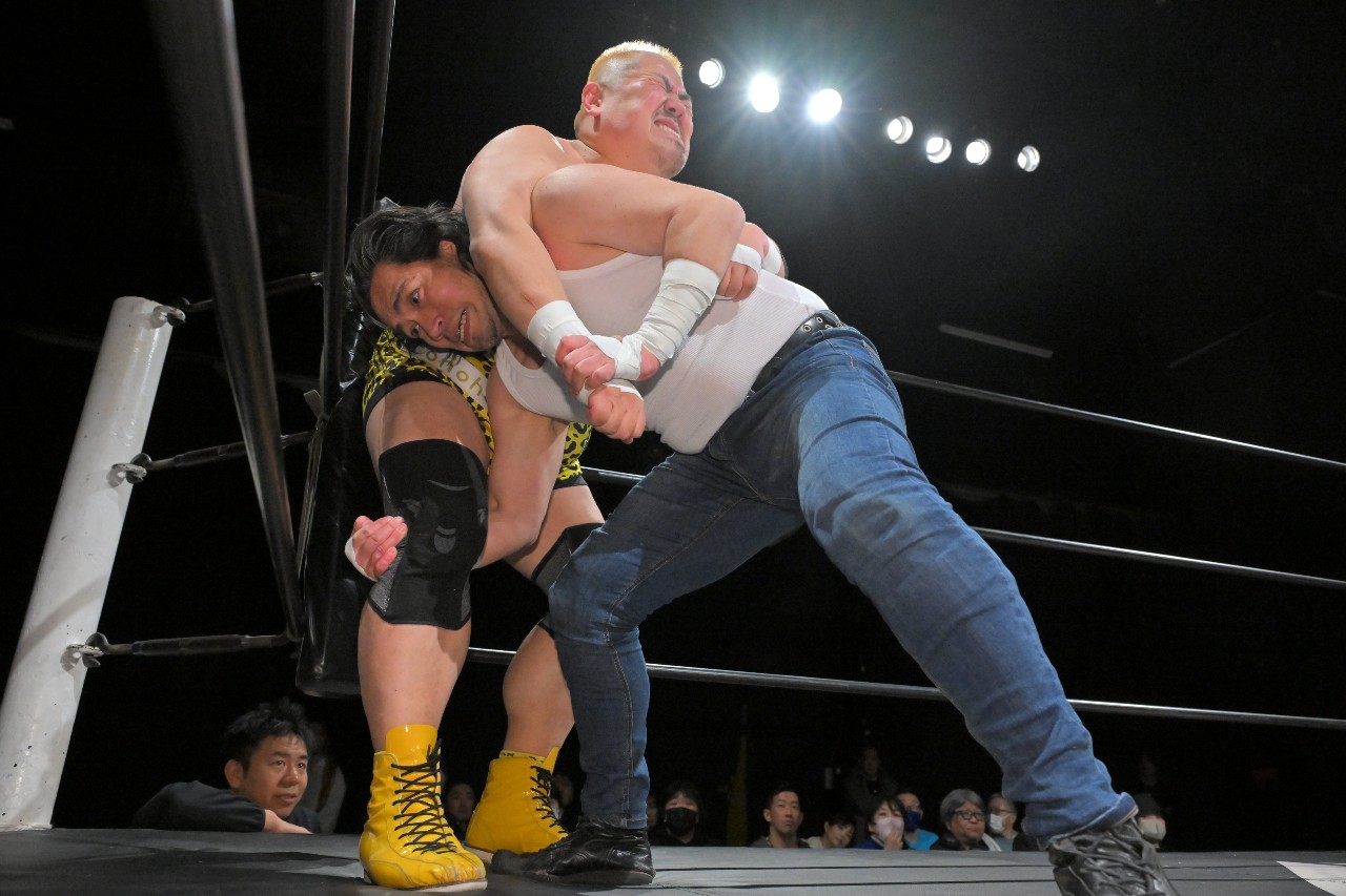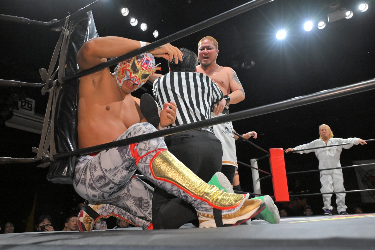 集中力を乱された定が思わず「静かにして?!」とツッコミを入れると、瀧澤が紙テープを客席に向けて投げ入れる奇行で応える。気が散って仕方ない定の隙を突いて秀旺がアンクルロックに捕らえると、定は慌ててロープブレイク。思わぬダメージを負った定はエプロンへとエスケープ。